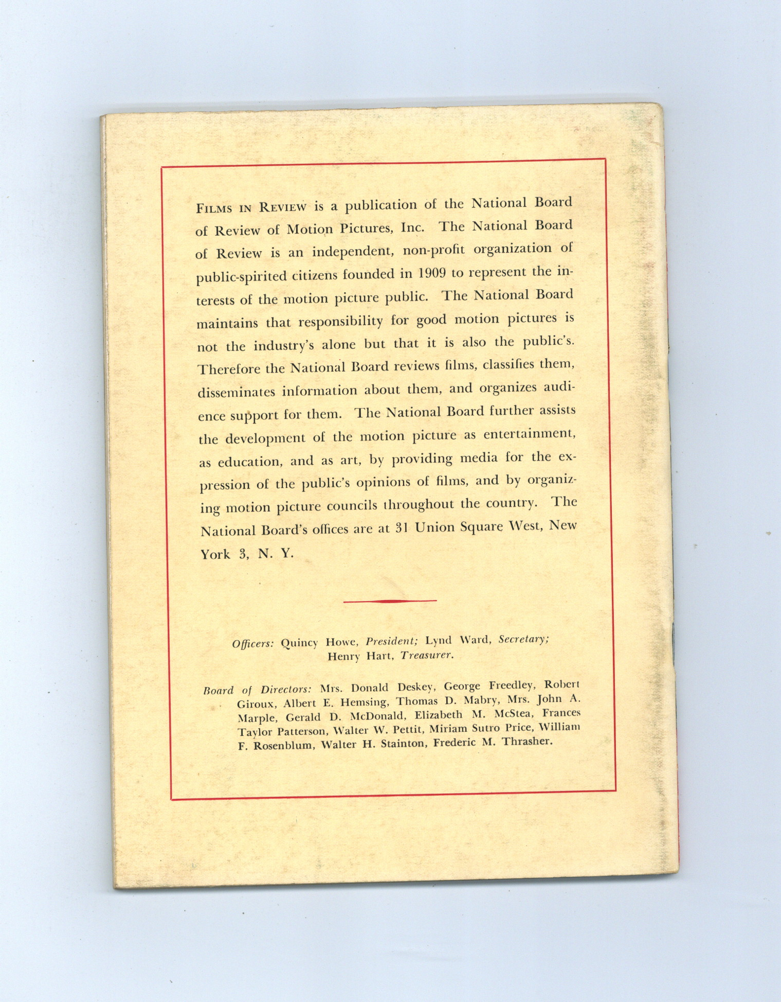 Published Dec 1954 by National Board of Review of Motion Pictures Inc..$20.50- Staple rust: Slight.