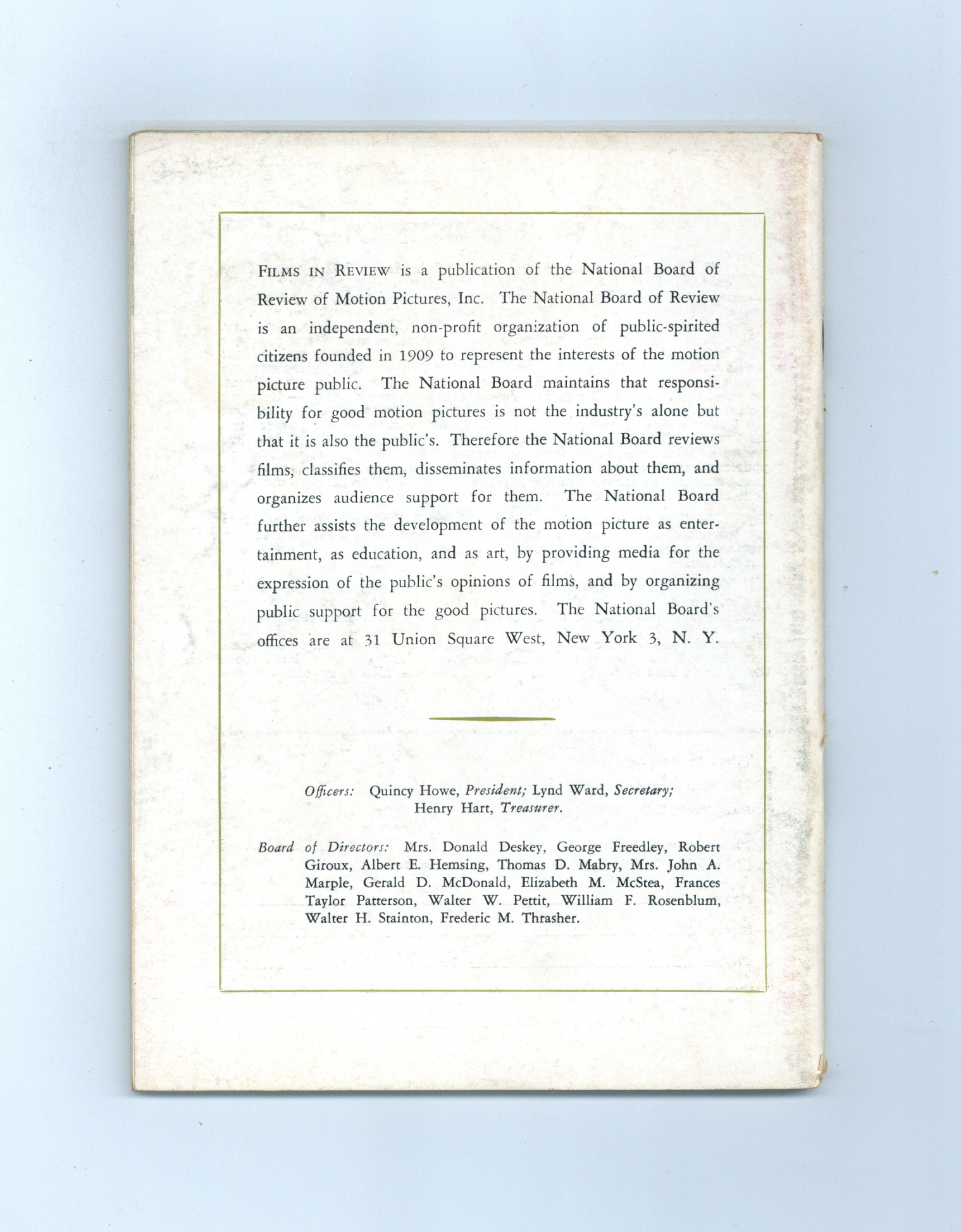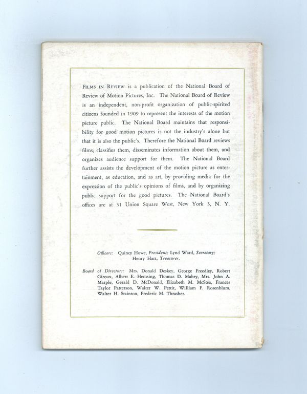 Film in Review is a publication of the National Board of Review of Motion Pictures, Inc, an independent, non-profit organization of public citizens founded in 1909 to represent the interests of the motion picture public. This National Board further assists the development of the motion picture as a source of entertainment, as education, and as art, by providing media for the expression of the public's opinion about films and their cultural and social effects. 5 1/2-in. x 7 1/2-in., 52 pages, B&W. Cover price $0.50.