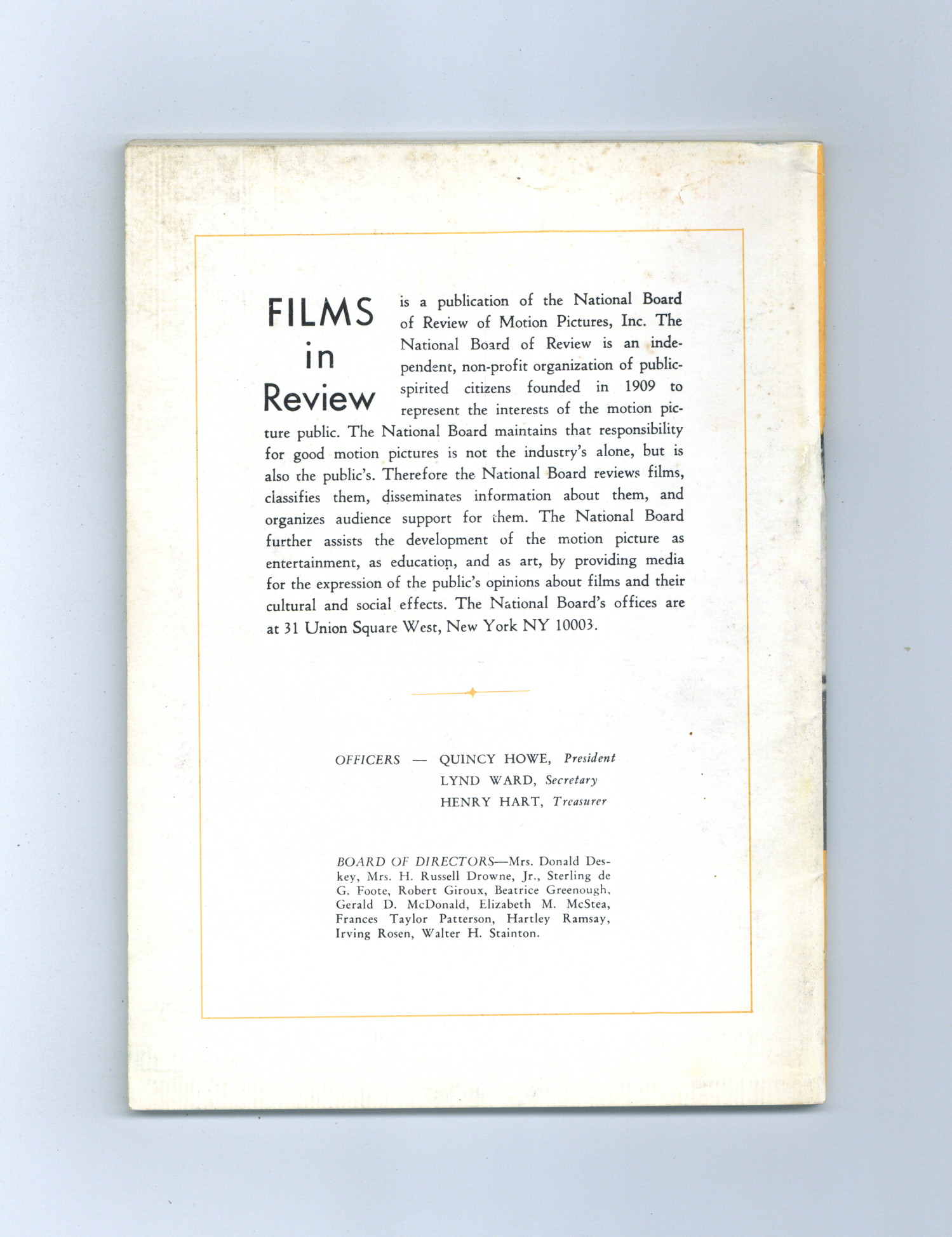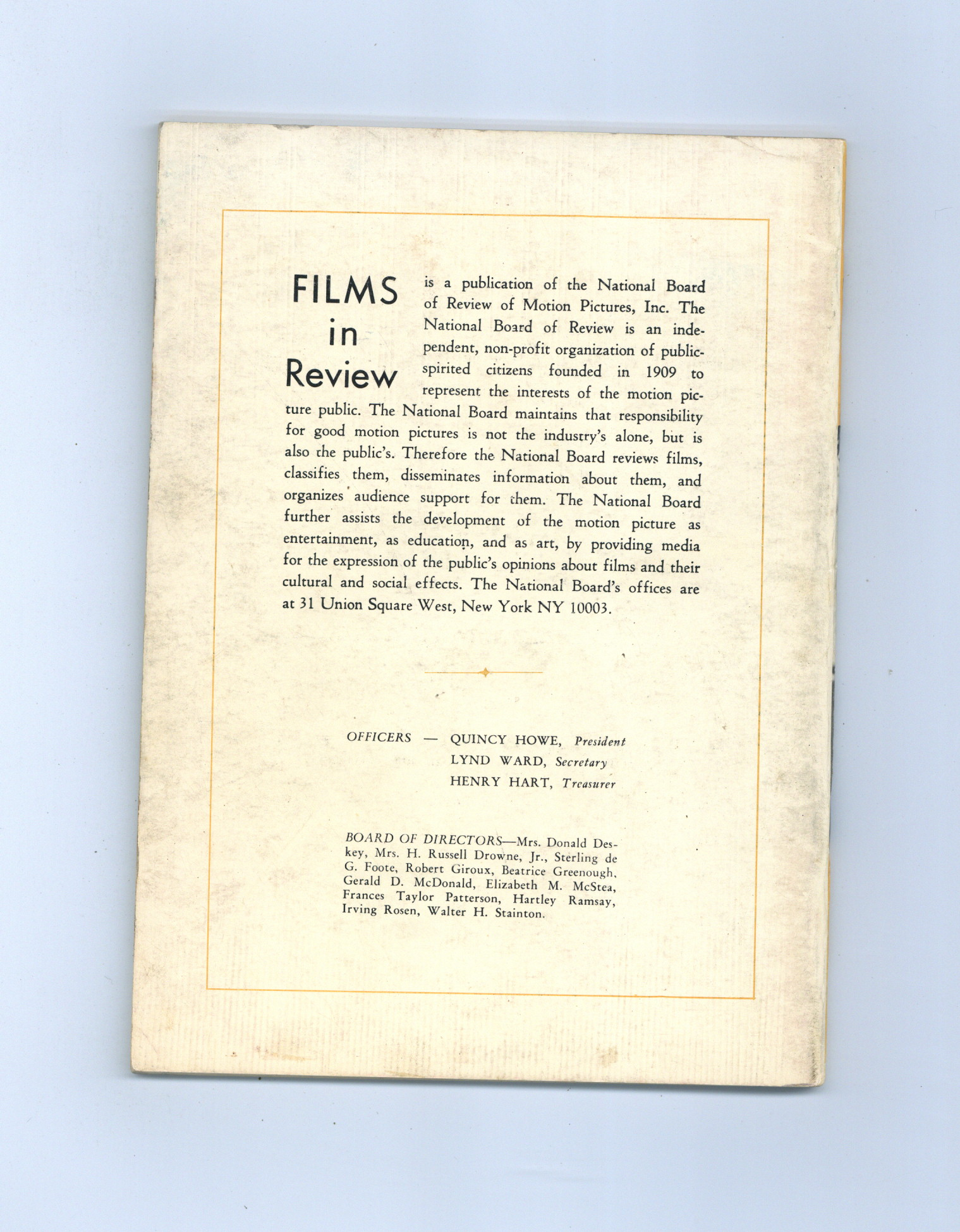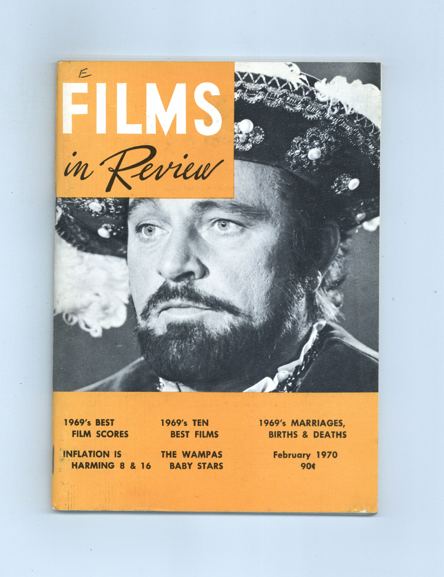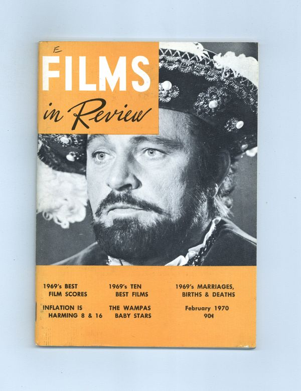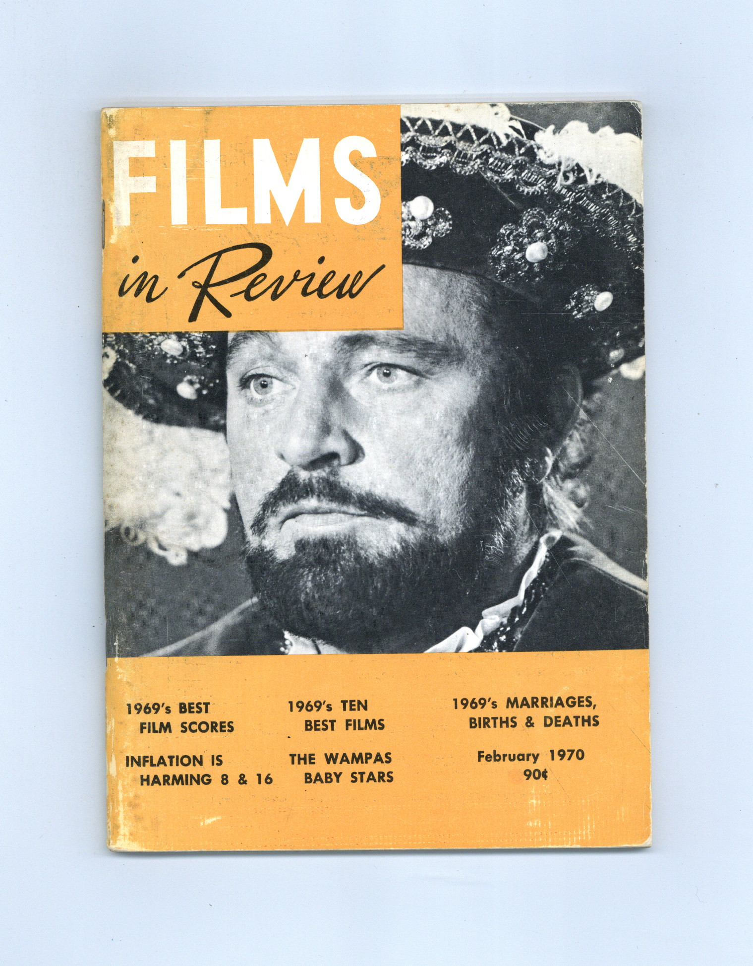 Published Feb 1970 by National Board of Review of Motion Pictures Inc..$10.00Film in Review is a publication of the National Board of Review of Motion Pictures, Inc, an independent, non-profit organization of public citizens founded in 1909 to represent the interests of the motion picture public. This National Board further assists the development of the motion picture as a source of entertainment, as education, and as art, by providing media for the expression of the public's opinion about films and their cultural and social effects. 5 1/2-in. x 7 1/2-in., 64 pages, B&W. Cover price $0.90.