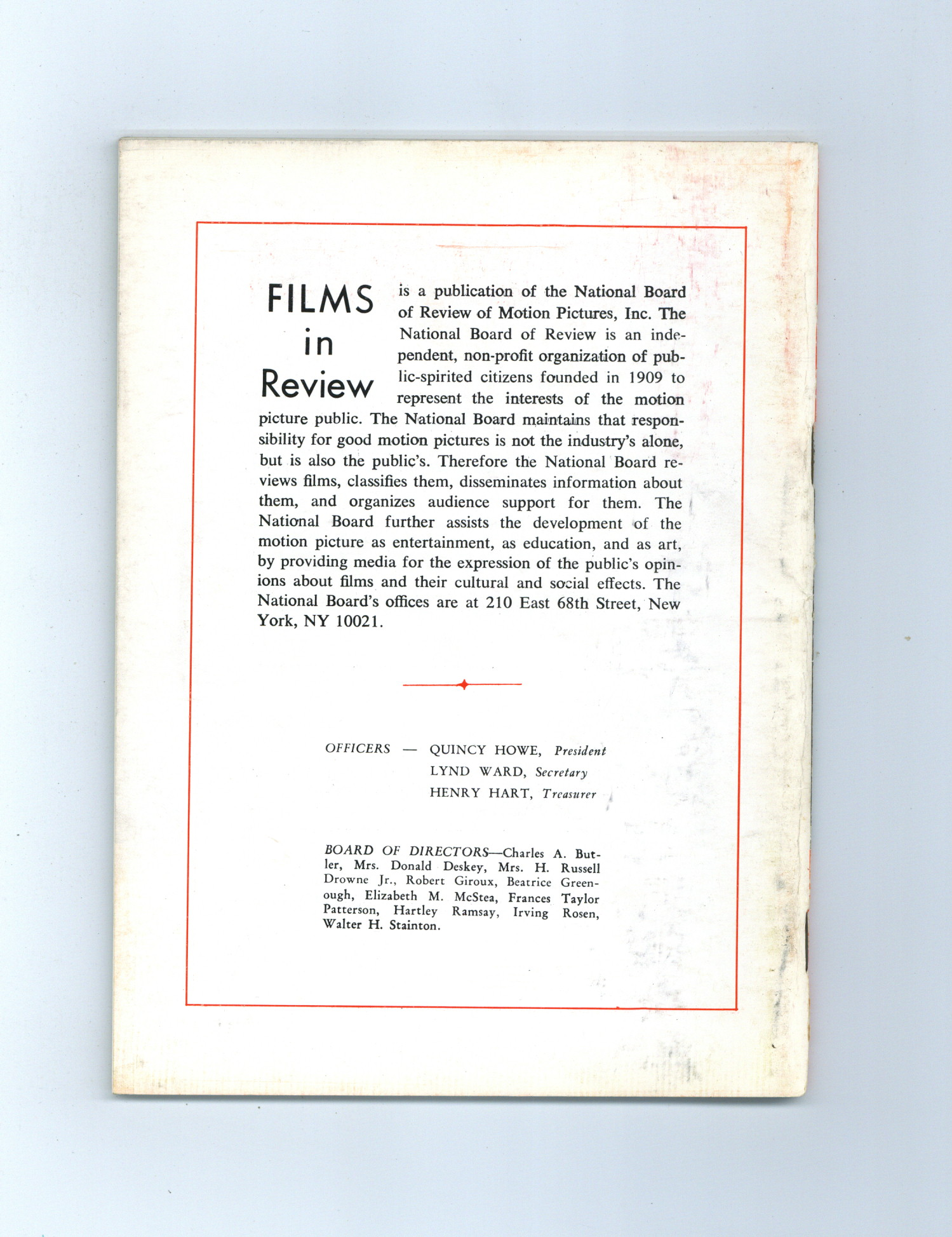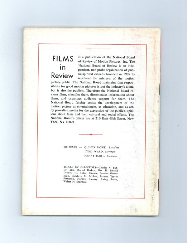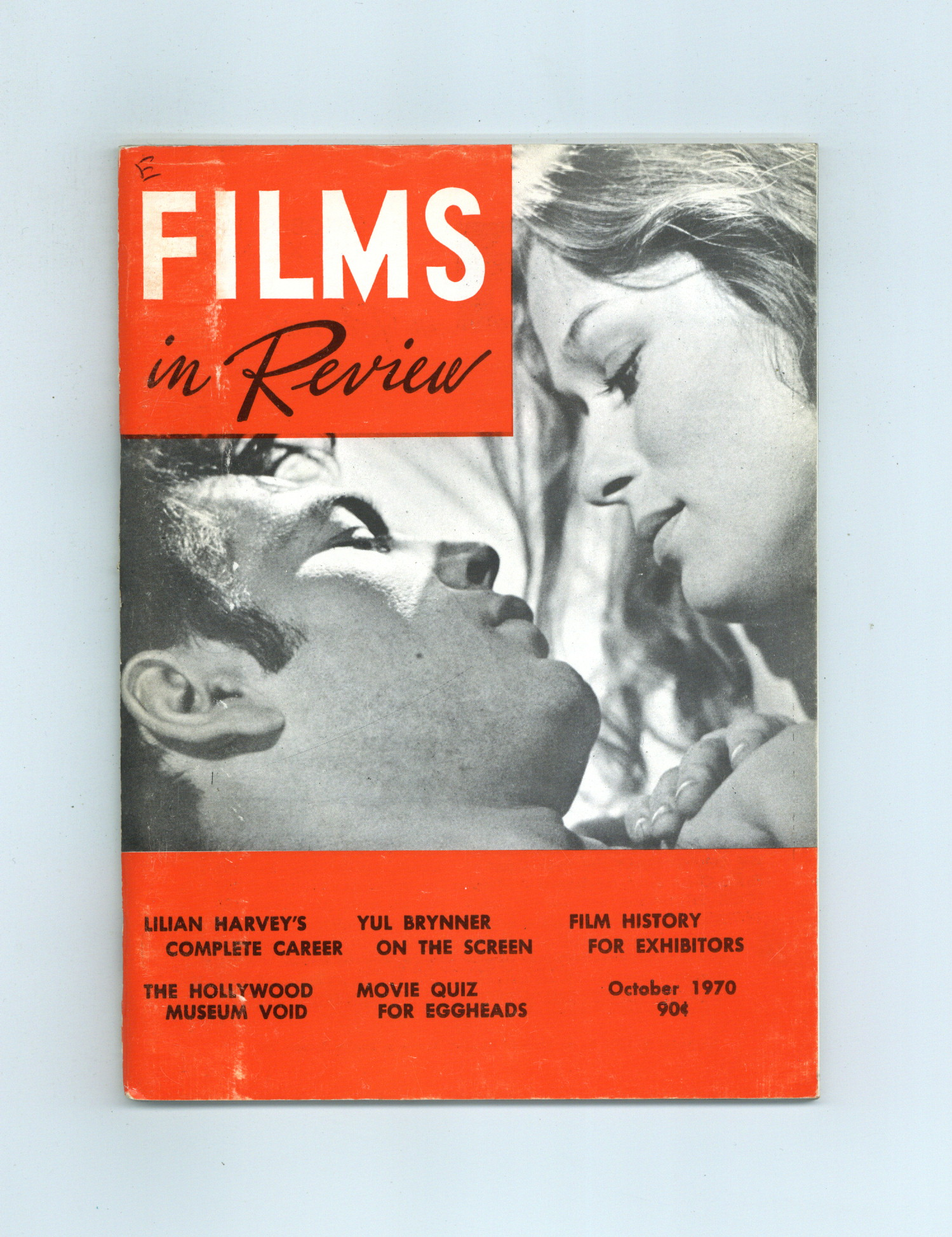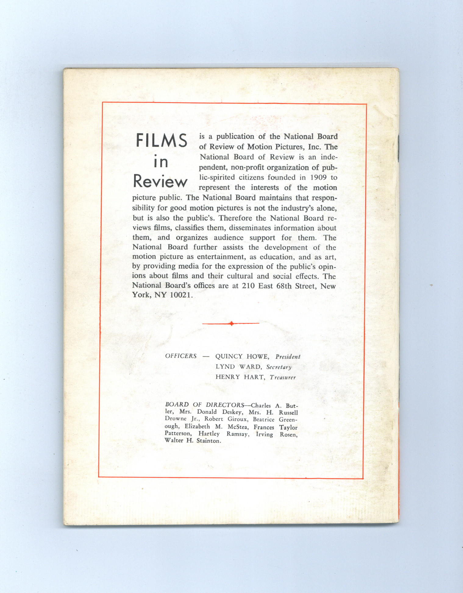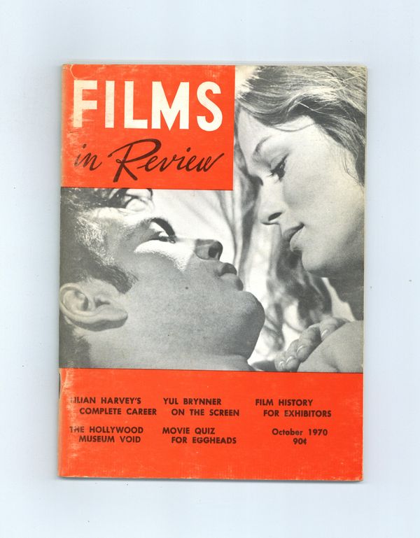 Published Oct 1970 by National Board of Review of Motion Pictures Inc..$5.80Film in Review is a publication of the National Board of Review of Motion Pictures, Inc, an independent, non-profit organization of public citizens founded in 1909 to represent the interests of the motion picture public. This National Board further assists the development of the motion picture as a source of entertainment, as education, and as art, by providing media for the expression of the public's opinion about films and their cultural and social effects. 5 1/2-in. x 7 1/2-in., 64 pages, B&W. Cover price $0.90.