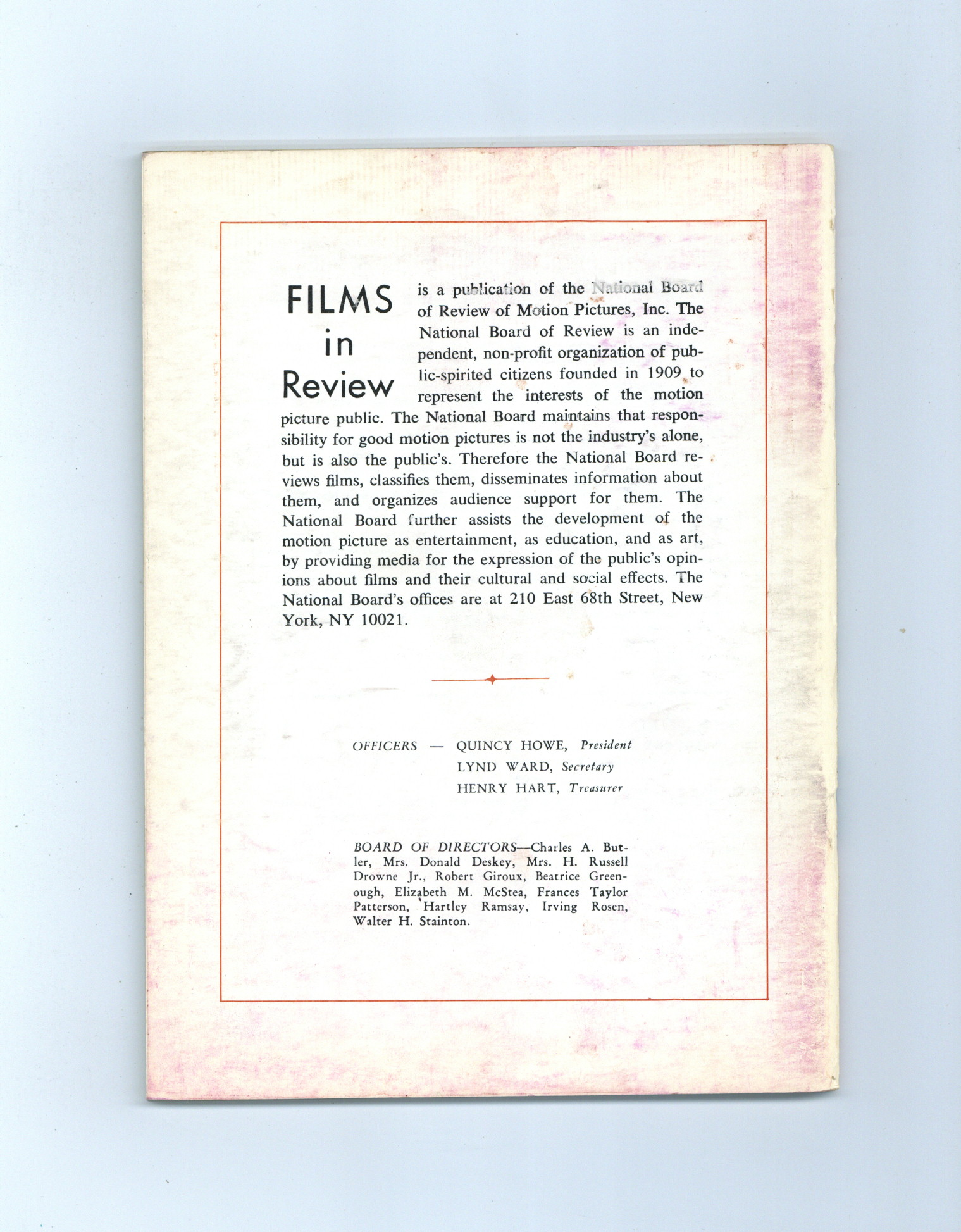 Film in Review is a publication of the National Board of Review of Motion Pictures, Inc, an independent, non-profit organization of public citizens founded in 1909 to represent the interests of the motion picture public. This National Board further assists the development of the motion picture as a source of entertainment, as education, and as art, by providing media for the expression of the public's opinion about films and their cultural and social effects. 5 1/2-in. x 7 1/2-in., 64 pages, B&W. Cover price $0.90.