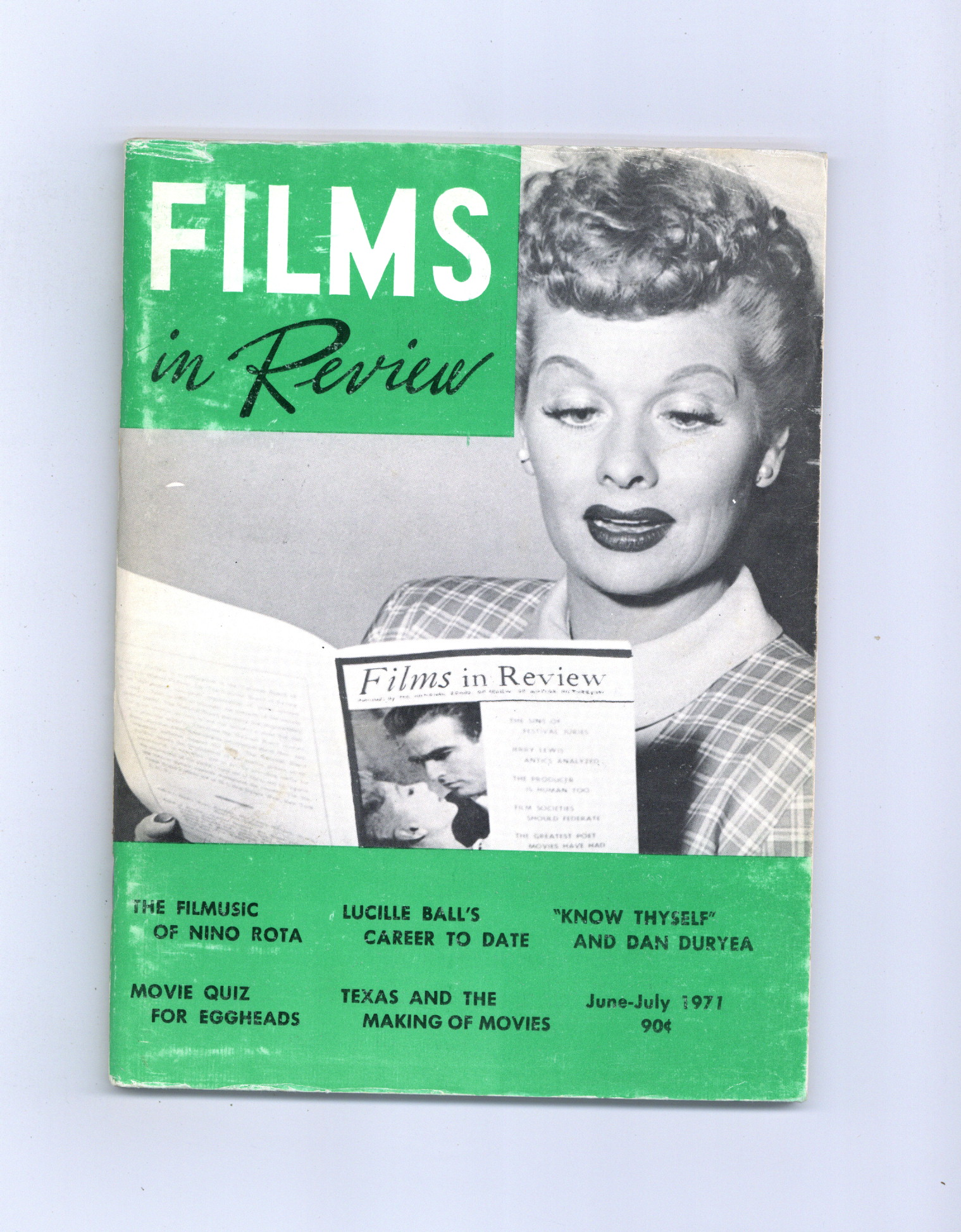 Published Jun 1971 by National Board of Review of Motion Pictures Inc..$12.00Film in Review is a publication of the National Board of Review of Motion Pictures, Inc, an independent, non-profit organization of public citizens founded in 1909 to represent the interests of the motion picture public. This National Board further assists the development of the motion picture as a source of entertainment, as education, and as art, by providing media for the expression of the public's opinion about films and their cultural and social effects. 5 1/2-in. x 7 1/2-in., 64 pages, B&W. Cover price $0.90.
