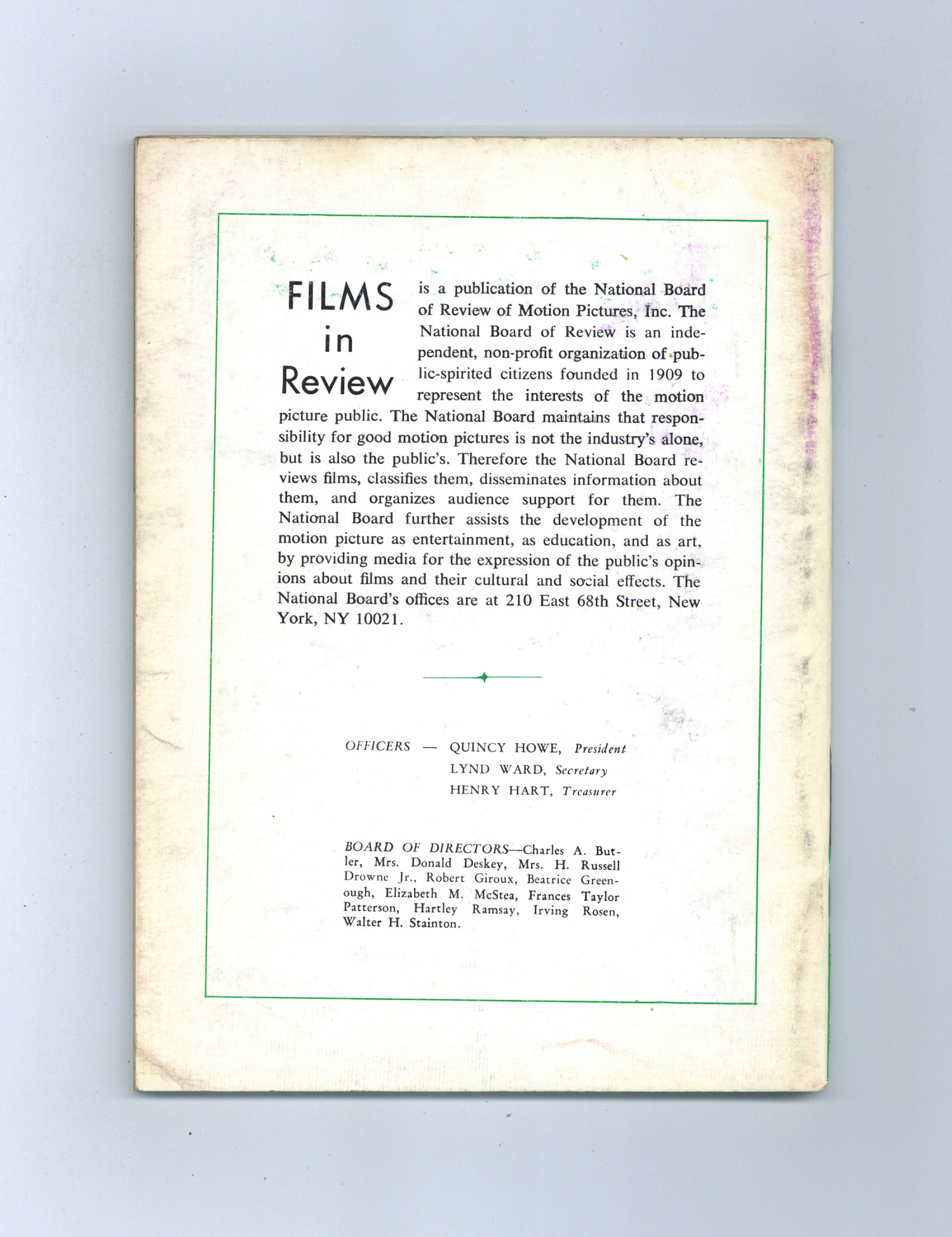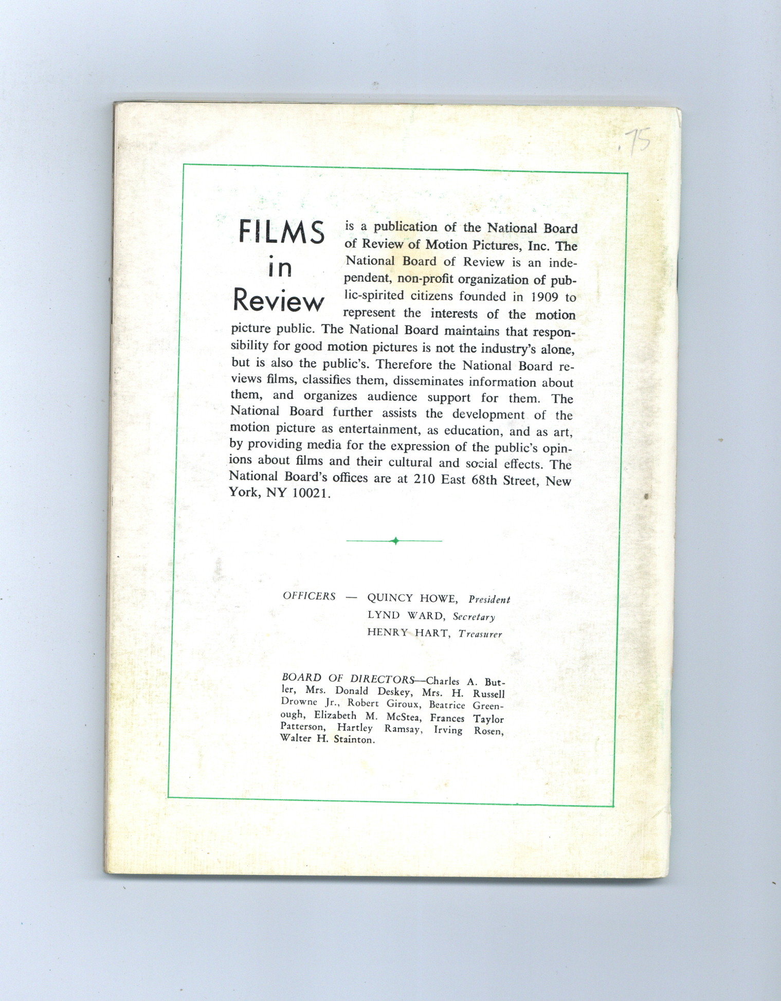 Film in Review is a publication of the National Board of Review of Motion Pictures, Inc, an independent, non-profit organization of public citizens founded in 1909 to represent the interests of the motion picture public. This National Board further assists the development of the motion picture as a source of entertainment, as education, and as art, by providing media for the expression of the public's opinion about films and their cultural and social effects. 5 1/2-in. x 7 1/2-in., 64 pages, B&W. Cover price $0.90.