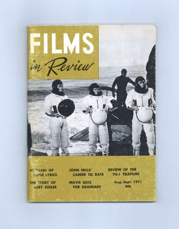 Published Aug 1971 by National Board of Review of Motion Pictures Inc..$12.00Film in Review is a publication of the National Board of Review of Motion Pictures, Inc, an independent, non-profit organization of public citizens founded in 1909 to represent the interests of the motion picture public. This National Board further assists the development of the motion picture as a source of entertainment, as education, and as art, by providing media for the expression of the public's opinion about films and their cultural and social effects. 5 1/2-in. x 7 1/2-in., 72 pages, B&W. Cover price $0.90.