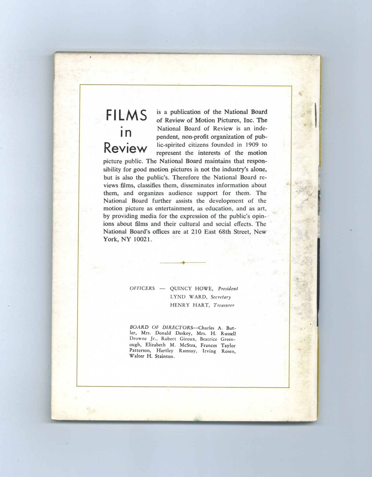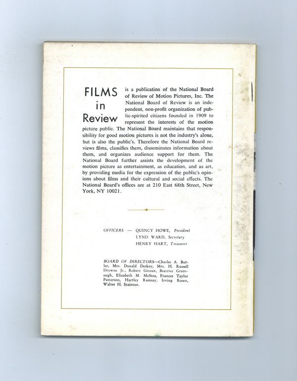 Film in Review is a publication of the National Board of Review of Motion Pictures, Inc, an independent, non-profit organization of public citizens founded in 1909 to represent the interests of the motion picture public. This National Board further assists the development of the motion picture as a source of entertainment, as education, and as art, by providing media for the expression of the public's opinion about films and their cultural and social effects. 5 1/2-in. x 7 1/2-in., 72 pages, B&W. Cover price $0.90.