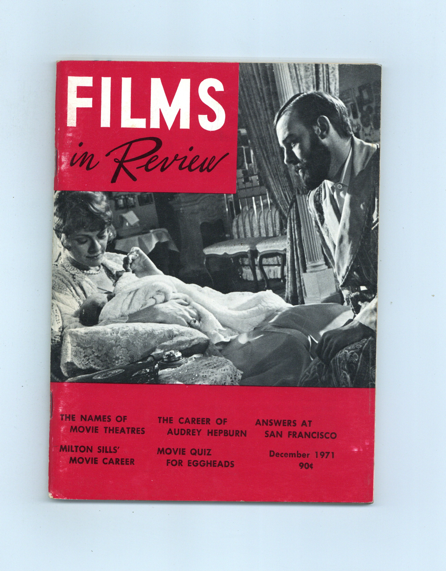 Published Dec 1971 by National Board of Review of Motion Pictures Inc..$8.00Film in Review is a publication of the National Board of Review of Motion Pictures, Inc, an independent, non-profit organization of public citizens founded in 1909 to represent the interests of the motion picture public. This National Board further assists the development of the motion picture as a source of entertainment, as education, and as art, by providing media for the expression of the public's opinion about films and their cultural and social effects. 5 1/2-in. x 7 1/2-in., 64 pages, B&W. Cover price $0.90.