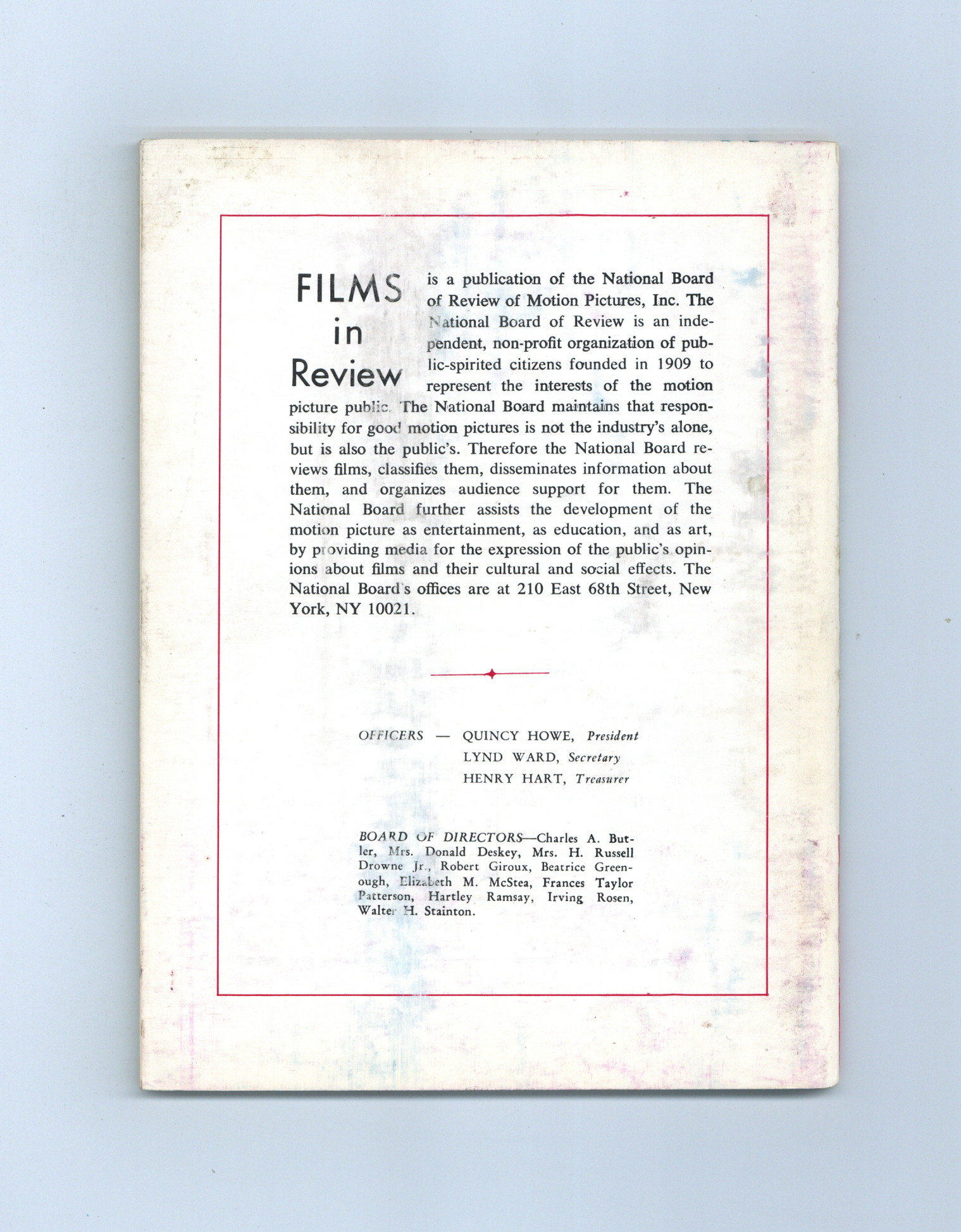 Film in Review is a publication of the National Board of Review of Motion Pictures, Inc, an independent, non-profit organization of public citizens founded in 1909 to represent the interests of the motion picture public. This National Board further assists the development of the motion picture as a source of entertainment, as education, and as art, by providing media for the expression of the public's opinion about films and their cultural and social effects. 5 1/2-in. x 7 1/2-in., 64 pages, B&W. Cover price $0.90.
