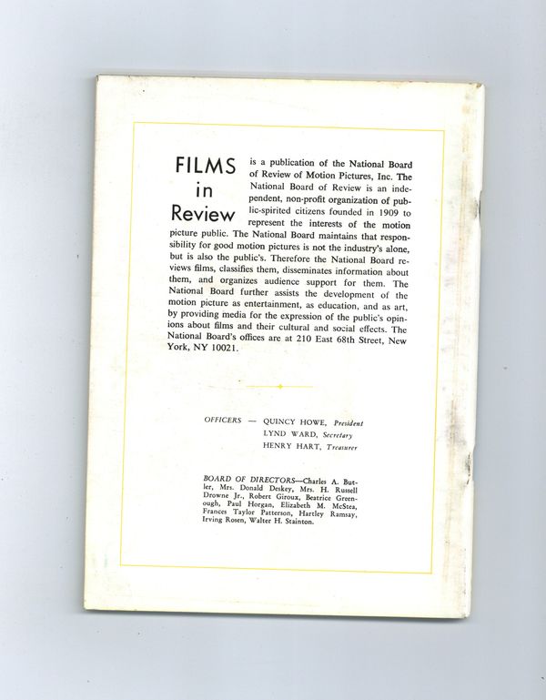 Film in Review is a publication of the National Board of Review of Motion Pictures, Inc, an independent, non-profit organization of public citizens founded in 1909 to represent the interests of the motion picture public. This National Board further assists the development of the motion picture as a source of entertainment, as education, and as art, by providing media for the expression of the public's opinion about films and their cultural and social effects. 5 1/2-in. x 7 1/2-in., 64 pages, B&W. Cover price $0.90.