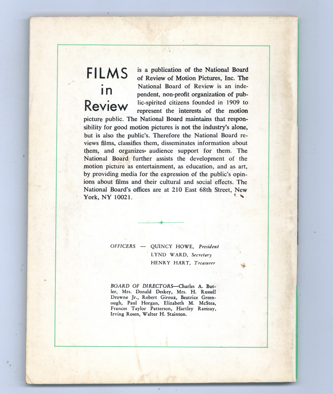 Film in Review is a publication of the National Board of Review of Motion Pictures, Inc, an independent, non-profit organization of public citizens founded in 1909 to represent the interests of the motion picture public. This National Board further assists the development of the motion picture as a source of entertainment, as education, and as art, by providing media for the expression of the public's opinion about films and their cultural and social effects. 5 1/2-in. x 7 1/2-in., 64 pages, B&W. Cover price $0.90.