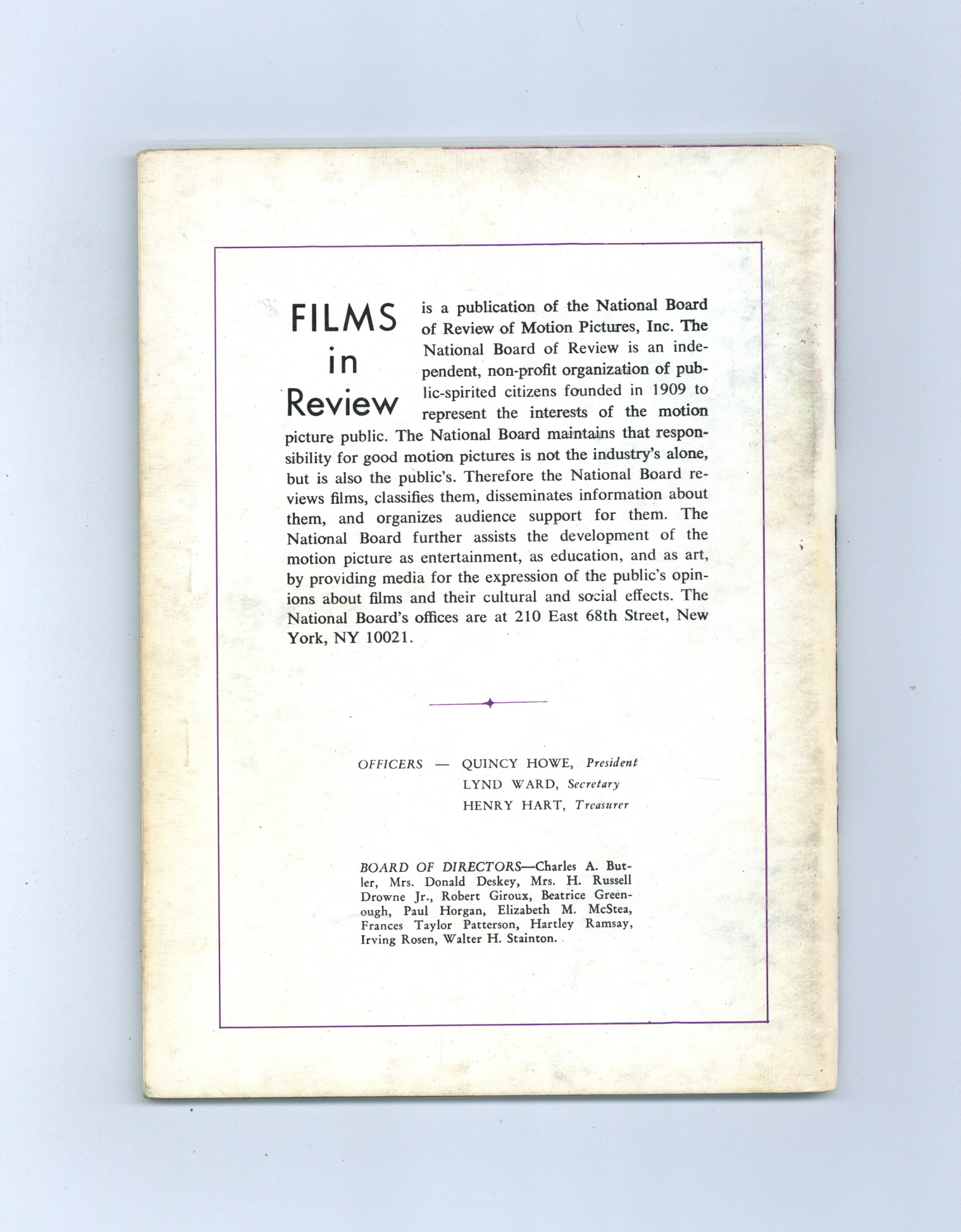 Film in Review is a publication of the National Board of Review of Motion Pictures, Inc, an independent, non-profit organization of public citizens founded in 1909 to represent the interests of the motion picture public. This National Board further assists the development of the motion picture as a source of entertainment, as education, and as art, by providing media for the expression of the public's opinion about films and their cultural and social effects. 5 1/2-in. x 7 1/2-in., 64 pages, B&W. Cover price $0.90.