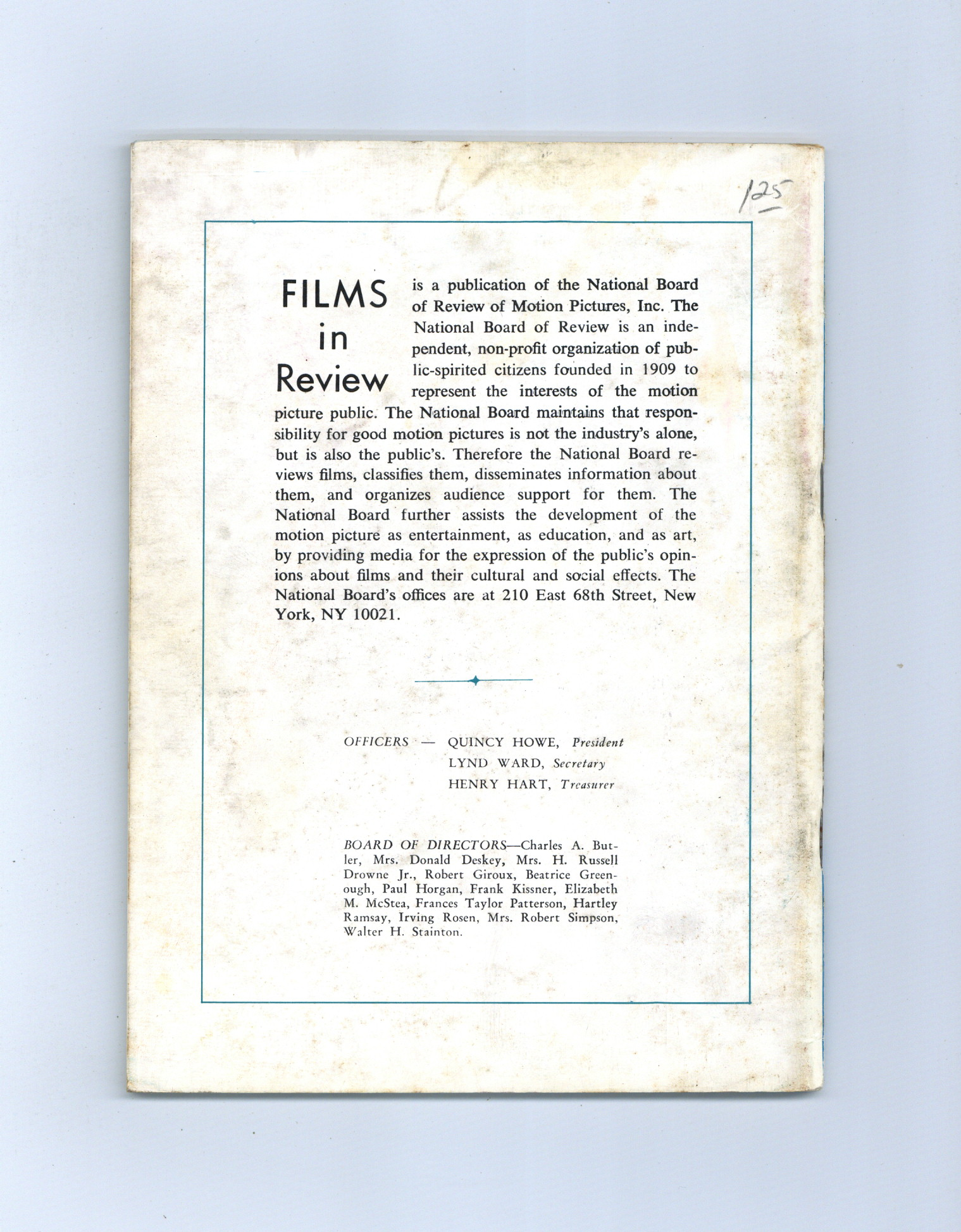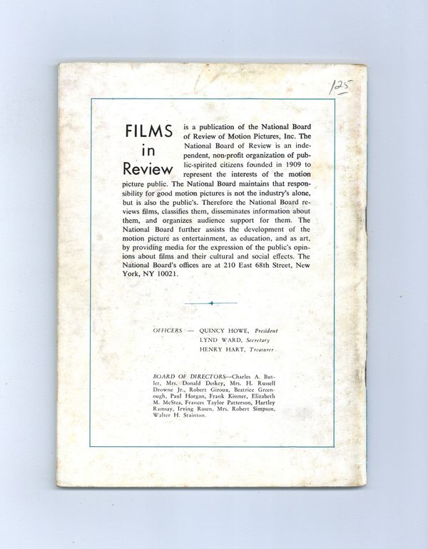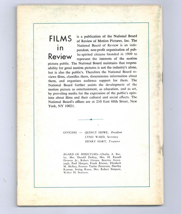 Film in Review is a publication of the National Board of Review of Motion Pictures, Inc, an independent, non-profit organization of public citizens founded in 1909 to represent the interests of the motion picture public. This National Board further assists the development of the motion picture as a source of entertainment, as education, and as art, by providing media for the expression of the public's opinion about films and their cultural and social effects. 5 1/2-in. x 7 1/2-in., 64 pages, B&W. Cover price $0.90.