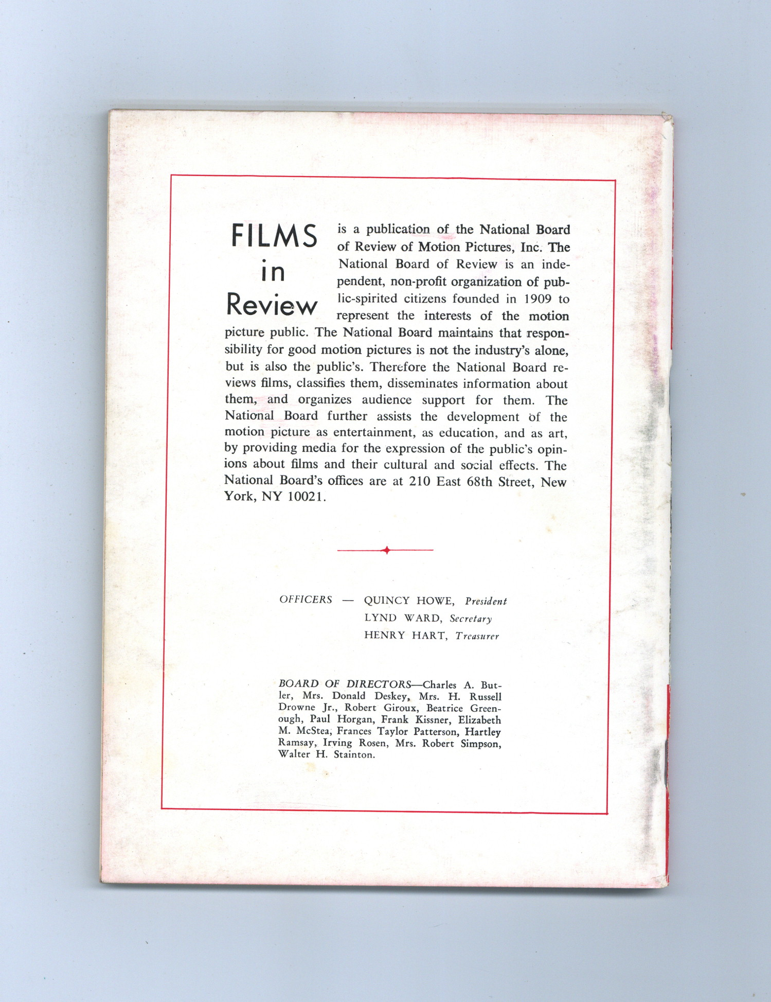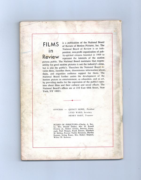 Film in Review is a publication of the National Board of Review of Motion Pictures, Inc, an independent, non-profit organization of public citizens founded in 1909 to represent the interests of the motion picture public. This National Board further assists the development of the motion picture as a source of entertainment, as education, and as art, by providing media for the expression of the public's opinion about films and their cultural and social effects. 5 1/2-in. x 7 1/2-in., 72 pages, B&W. Cover price $0.90.