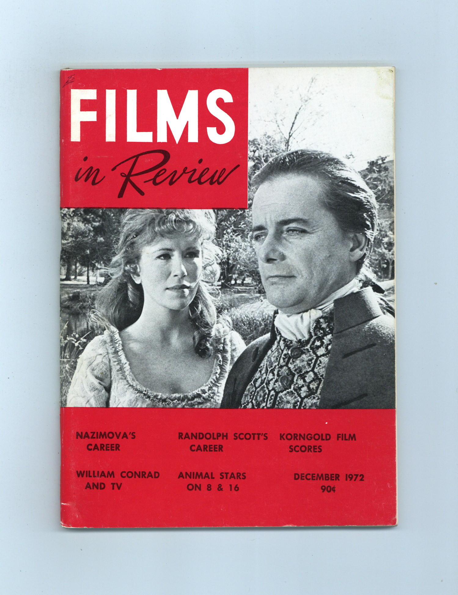 Published Dec 1972 by National Board of Review of Motion Pictures Inc..$7.80Film in Review is a publication of the National Board of Review of Motion Pictures, Inc, an independent, non-profit organization of public citizens founded in 1909 to represent the interests of the motion picture public. This National Board further assists the development of the motion picture as a source of entertainment, as education, and as art, by providing media for the expression of the public's opinion about films and their cultural and social effects. 5 1/2-in. x 7 1/2-in., 72 pages, B&W. Cover price $0.90.