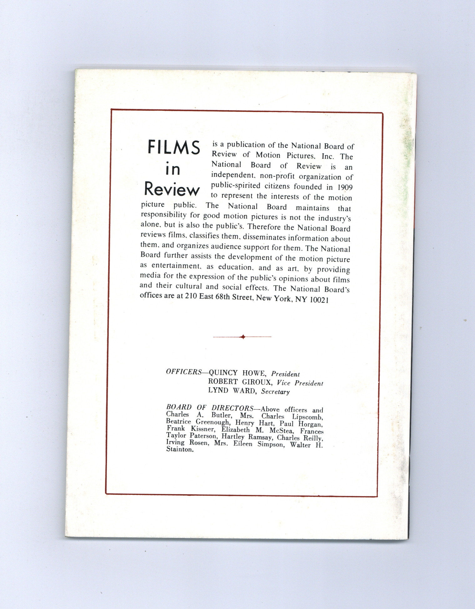Film in Review is a publication of the National Board of Review of Motion Pictures, Inc, an independent, non-profit organization of public citizens founded in 1909 to represent the interests of the motion picture public. This National Board further assists the development of the motion picture as a source of entertainment, as education, and as art, by providing media for the expression of the public's opinion about films and their cultural and social effects. 5 1/2-in. x 7 1/2-in., 64 pages, B&W. Cover price $1.00.