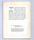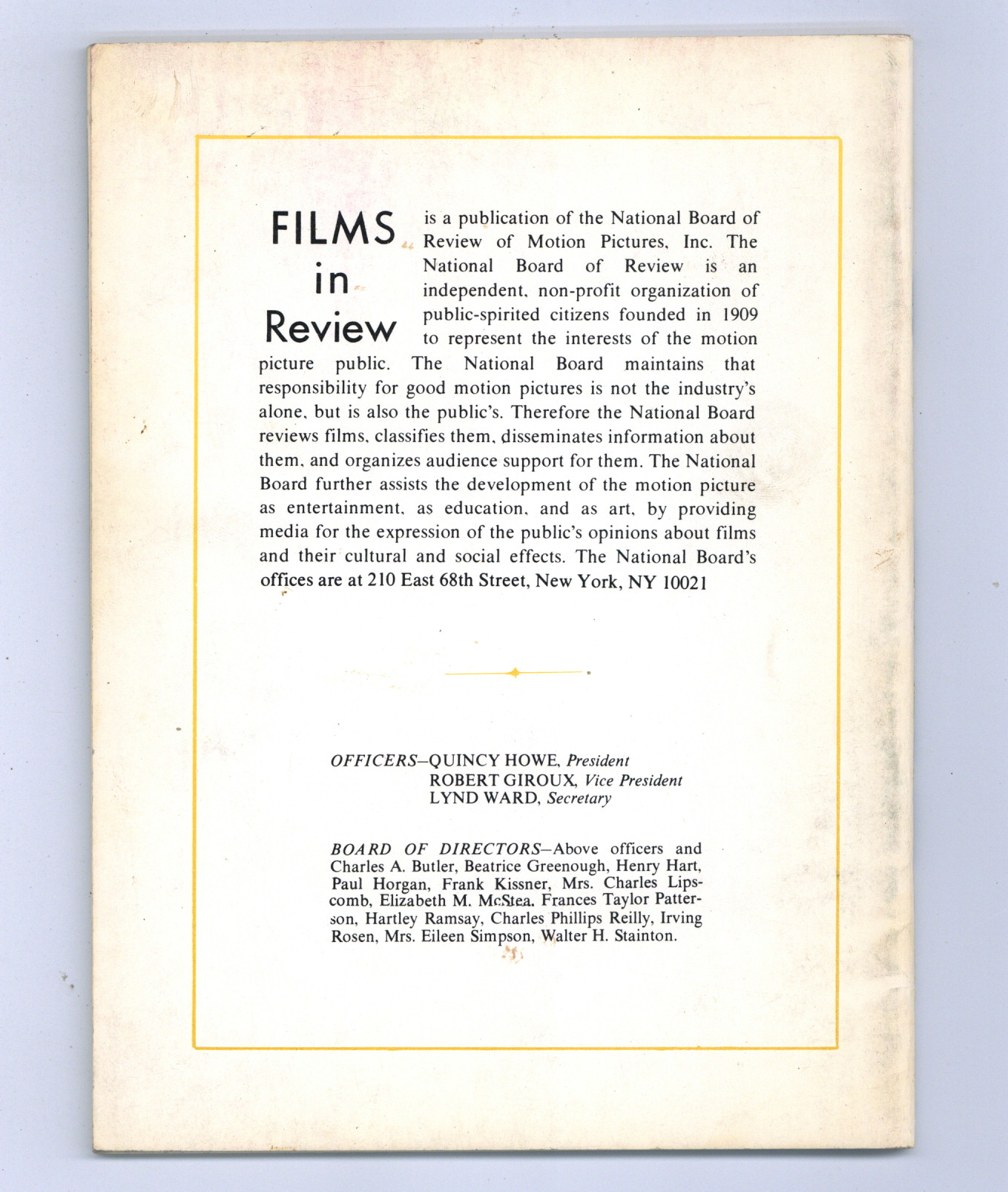 Film in Review is a publication of the National Board of Review of Motion Pictures, Inc, an independent, non-profit organization of public citizens founded in 1909 to represent the interests of the motion picture public. This National Board further assists the development of the motion picture as a source of entertainment, as education, and as art, by providing media for the expression of the public's opinion about films and their cultural and social effects. 5 1/2-in. x 7 1/2-in., 64 pages, B&W. Cover price $1.00.