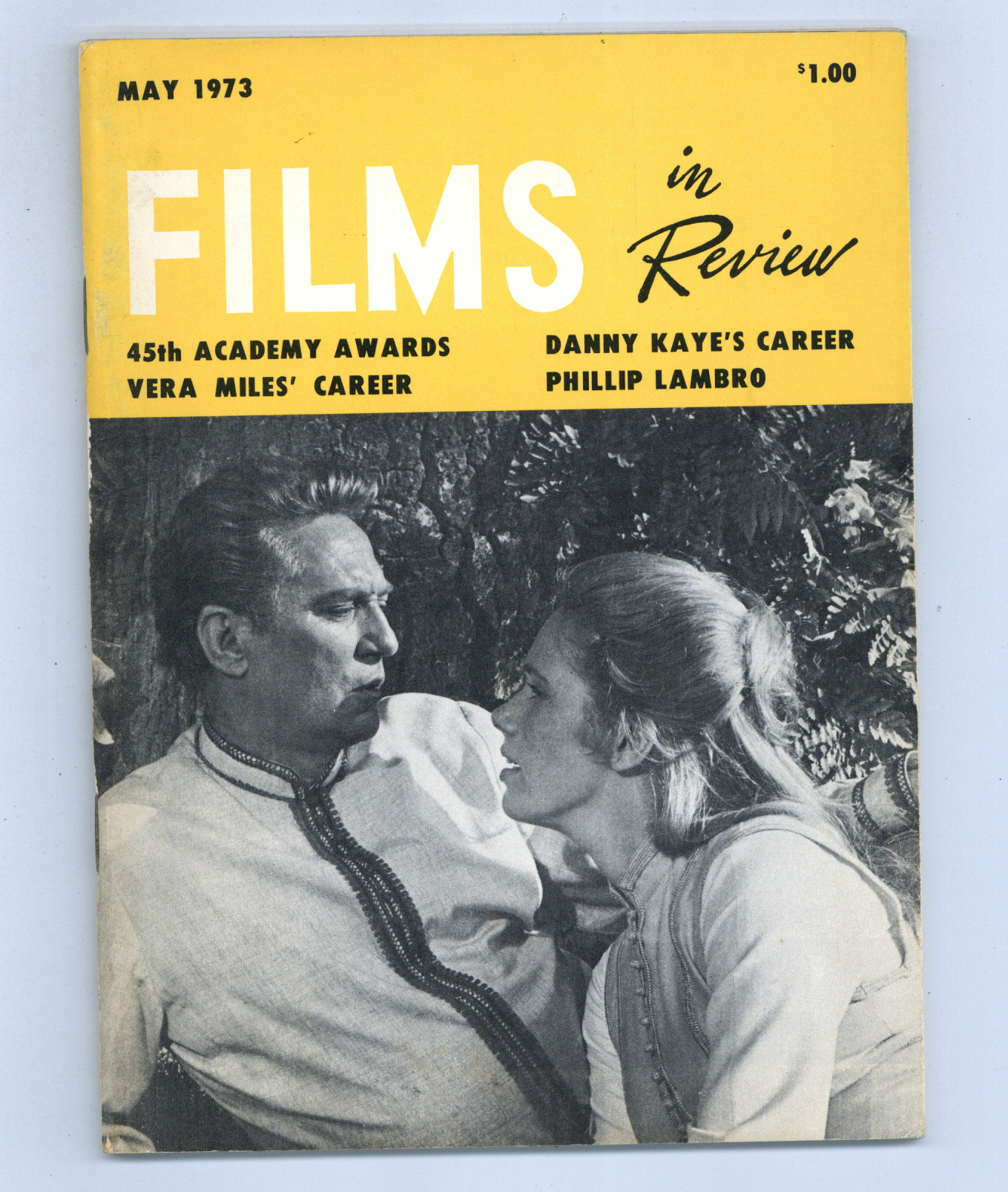 Published May 1973 by National Board of Review of Motion Pictures Inc..$12.00Film in Review is a publication of the National Board of Review of Motion Pictures, Inc, an independent, non-profit organization of public citizens founded in 1909 to represent the interests of the motion picture public. This National Board further assists the development of the motion picture as a source of entertainment, as education, and as art, by providing media for the expression of the public's opinion about films and their cultural and social effects. 5 1/2-in. x 7 1/2-in., 64 pages, B&W. Cover price $1.00.