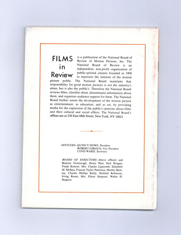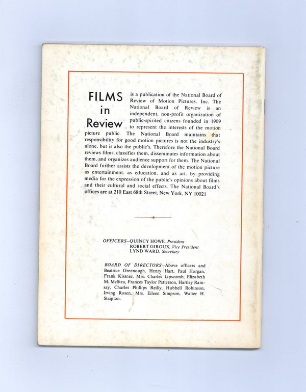Film in Review is a publication of the National Board of Review of Motion Pictures, Inc, an independent, non-profit organization of public citizens founded in 1909 to represent the interests of the motion picture public. This National Board further assists the development of the motion picture as a source of entertainment, as education, and as art, by providing media for the expression of the public's opinion about films and their cultural and social effects. 5 1/2-in. x 7 1/2-in., 64 pages, B&W. Cover price $1.00.