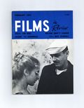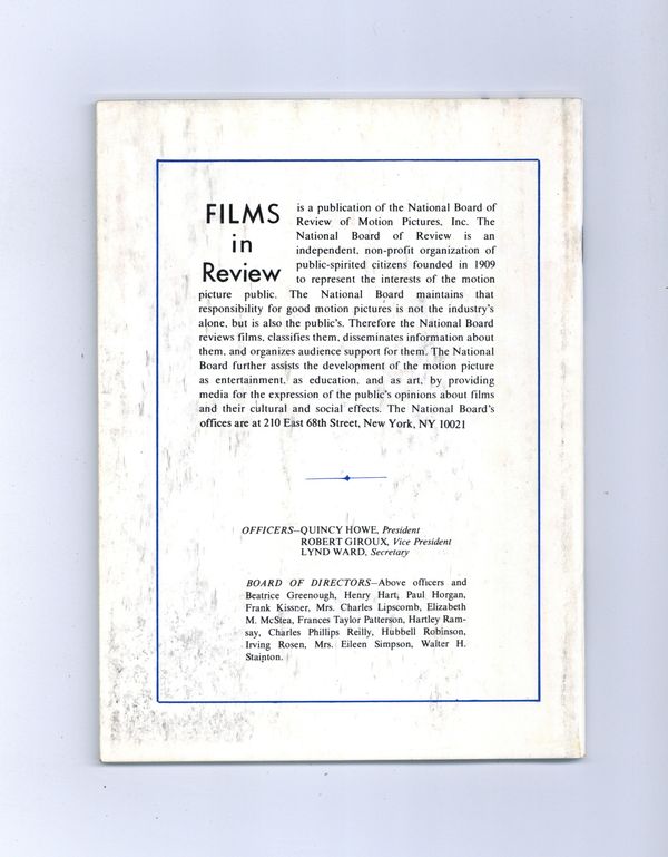 Film in Review is a publication of the National Board of Review of Motion Pictures, Inc, an independent, non-profit organization of public citizens founded in 1909 to represent the interests of the motion picture public. This National Board further assists the development of the motion picture as a source of entertainment, as education, and as art, by providing media for the expression of the public's opinion about films and their cultural and social effects. 5 1/2-in. x 7 1/2-in., 64 pages, B&W. Cover price $1.25.
