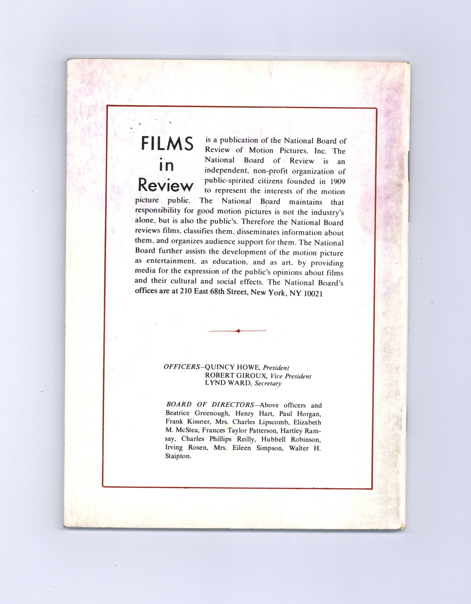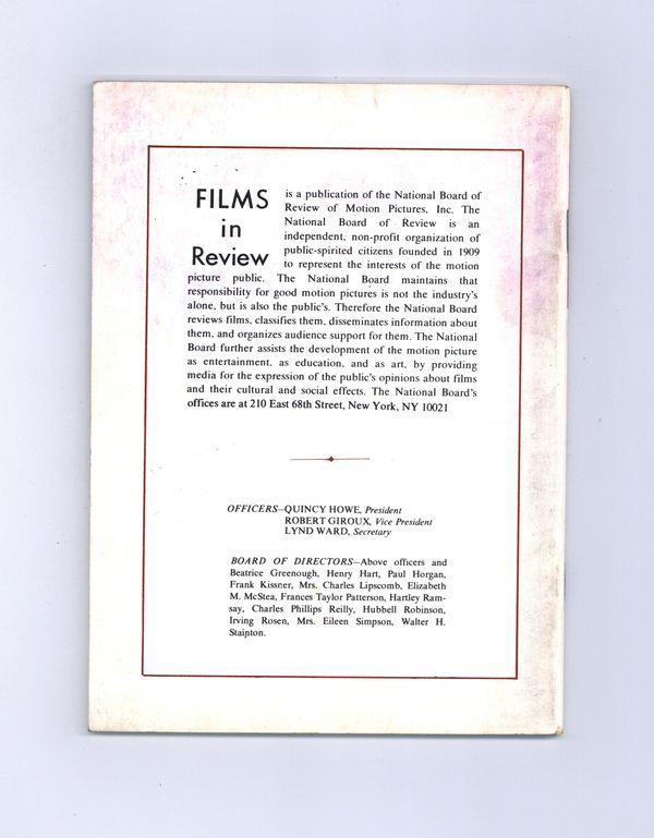 Film in Review is a publication of the National Board of Review of Motion Pictures, Inc, an independent, non-profit organization of public citizens founded in 1909 to represent the interests of the motion picture public. This National Board further assists the development of the motion picture as a source of entertainment, as education, and as art, by providing media for the expression of the public's opinion about films and their cultural and social effects. 5 1/2-in. x 7 1/2-in., 64 pages, B&W. Cover price $1.25.