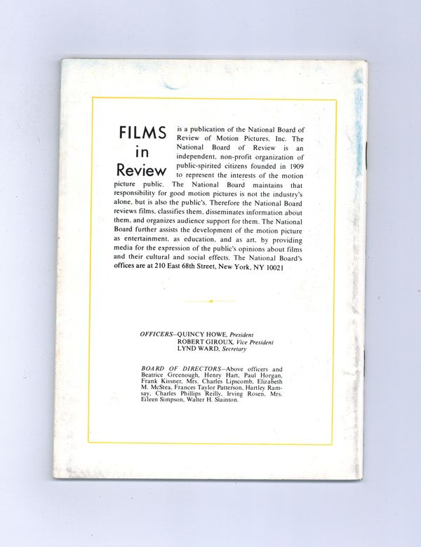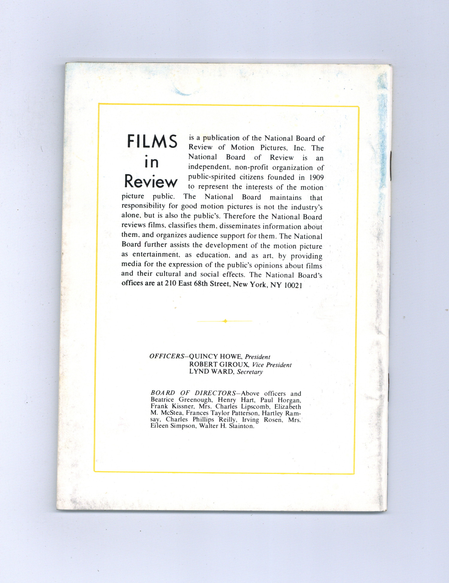 Film in Review is a publication of the National Board of Review of Motion Pictures, Inc, an independent, non-profit organization of public citizens founded in 1909 to represent the interests of the motion picture public. This National Board further assists the development of the motion picture as a source of entertainment, as education, and as art, by providing media for the expression of the public's opinion about films and their cultural and social effects. 5 1/2-in. x 7 1/2-in., 64 pages, B&W. Cover price $1.25.