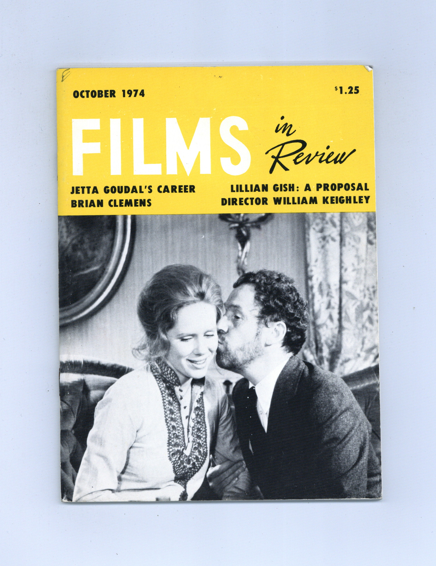 Published Oct 1974 by National Board of Review of Motion Pictures Inc..$10.00Film in Review is a publication of the National Board of Review of Motion Pictures, Inc, an independent, non-profit organization of public citizens founded in 1909 to represent the interests of the motion picture public. This National Board further assists the development of the motion picture as a source of entertainment, as education, and as art, by providing media for the expression of the public's opinion about films and their cultural and social effects. 5 1/2-in. x 7 1/2-in., 64 pages, B&W. Cover price $1.25.