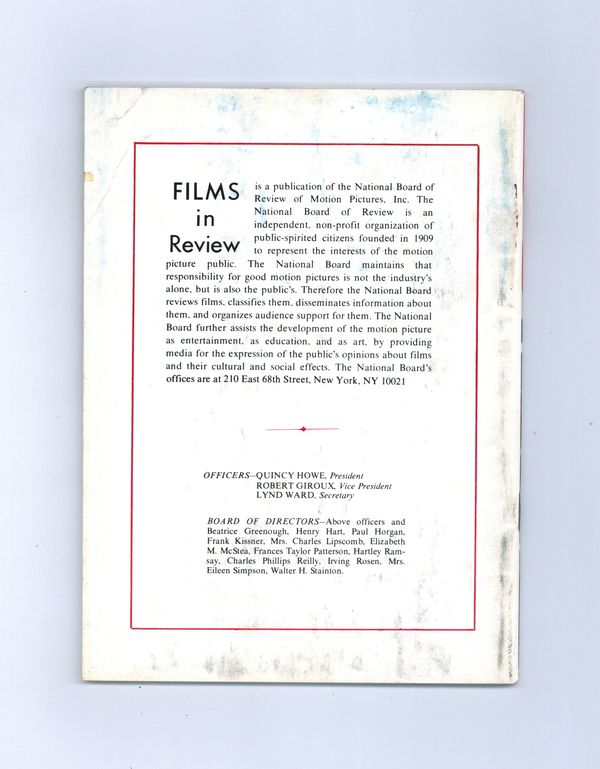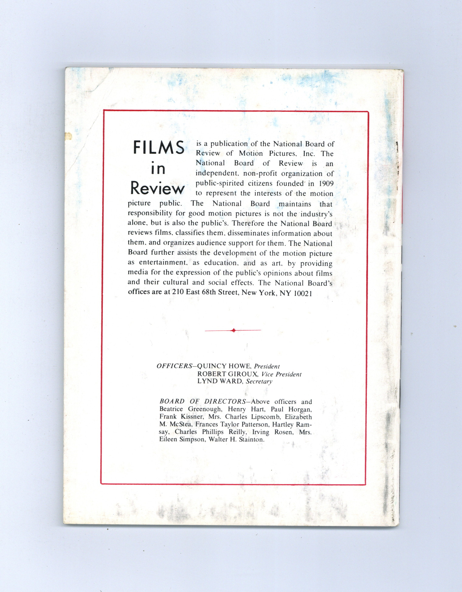 Film in Review is a publication of the National Board of Review of Motion Pictures, Inc, an independent, non-profit organization of public citizens founded in 1909 to represent the interests of the motion picture public. This National Board further assists the development of the motion picture as a source of entertainment, as education, and as art, by providing media for the expression of the public's opinion about films and their cultural and social effects. 5 1/2-in. x 7 1/2-in., 64 pages, B&W. Cover price $1.50.