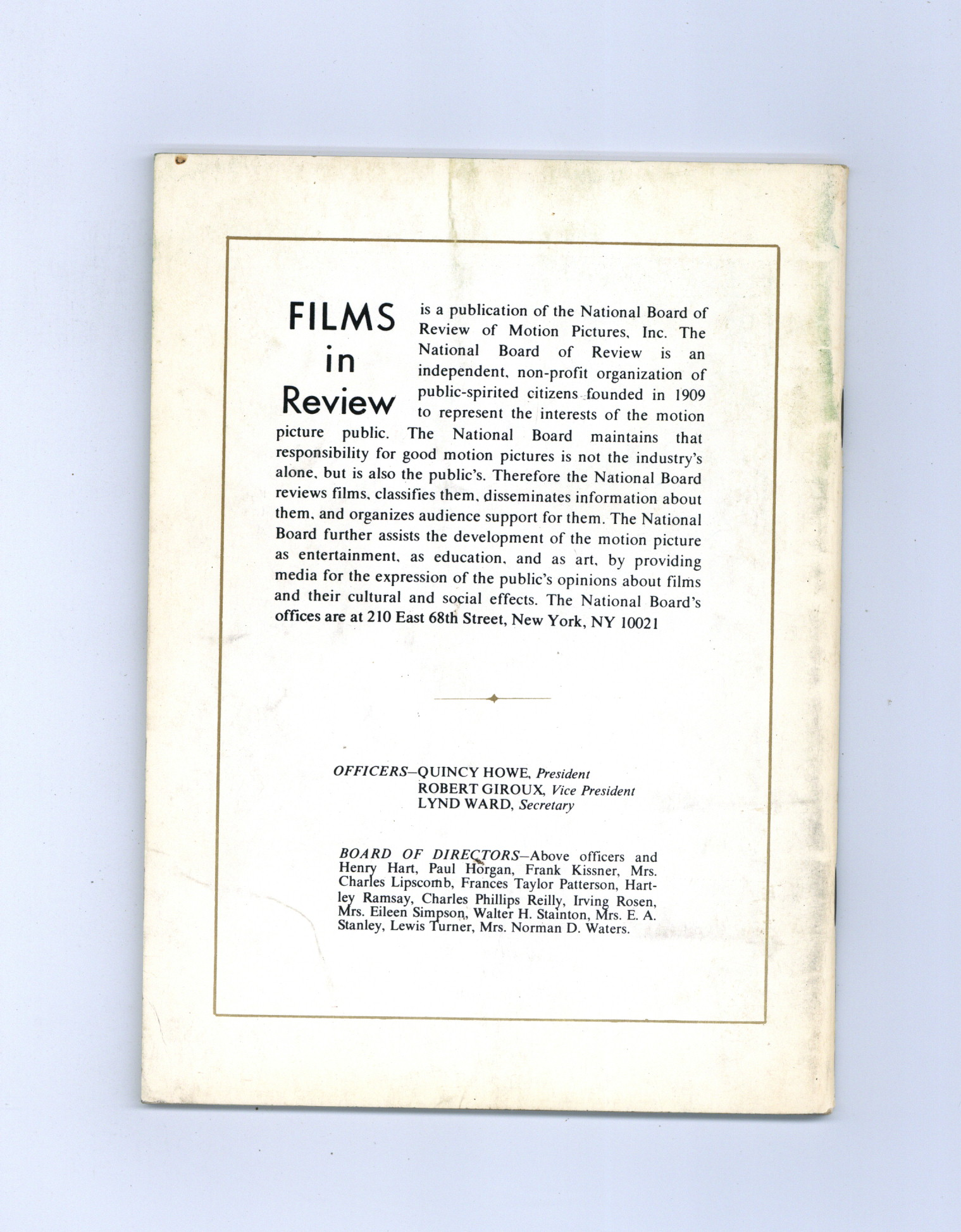 Film in Review is a publication of the National Board of Review of Motion Pictures, Inc, an independent, non-profit organization of public citizens founded in 1909 to represent the interests of the motion picture public. This National Board further assists the development of the motion picture as a source of entertainment, as education, and as art, by providing media for the expression of the public's opinion about films and their cultural and social effects. 5 1/2-in. x 7 1/2-in., 64 pages, B&W. Cover price $1.50.