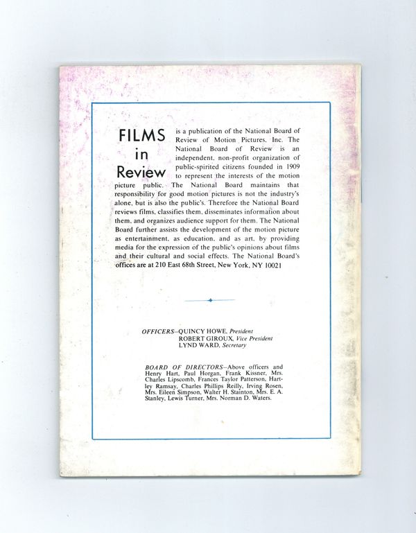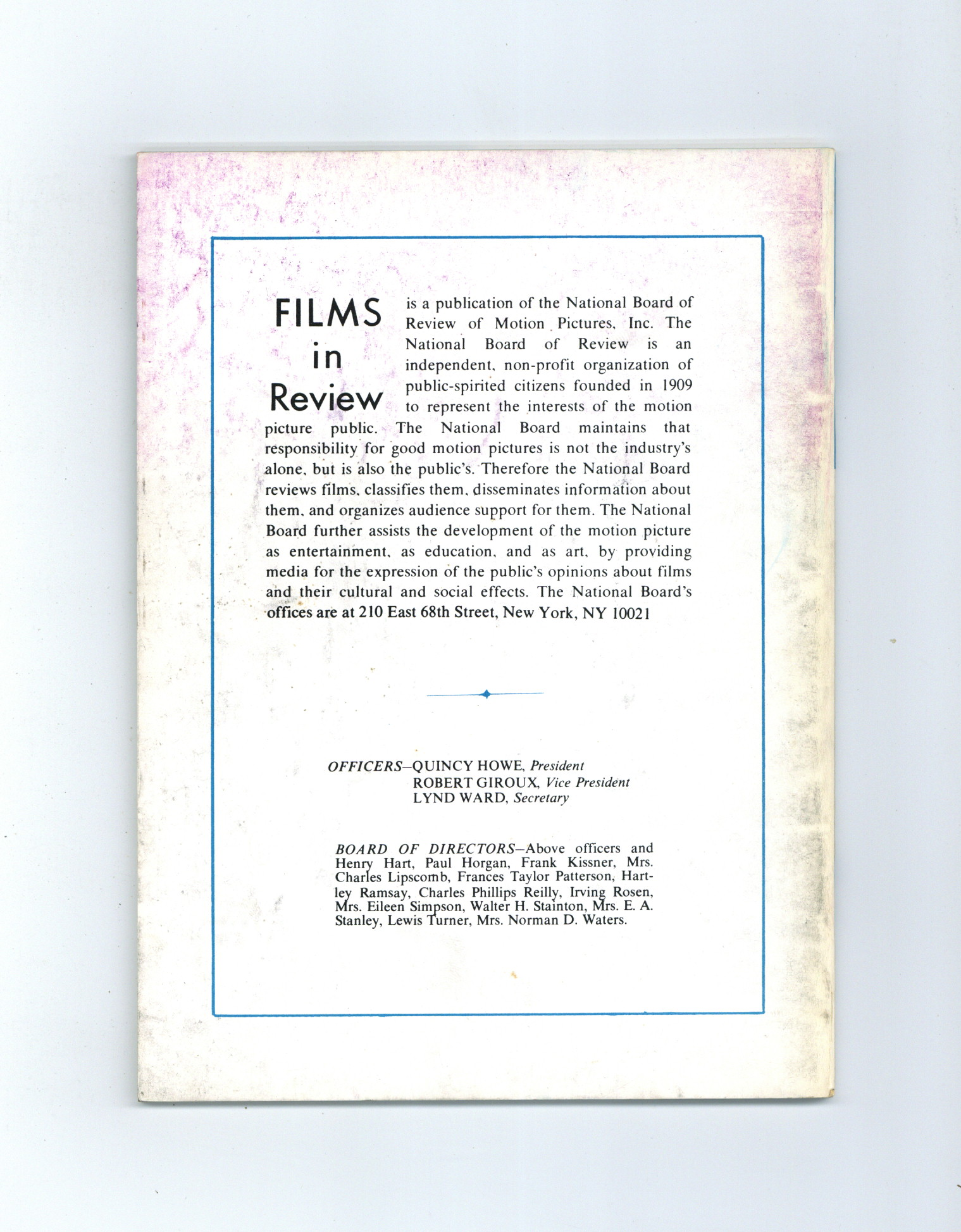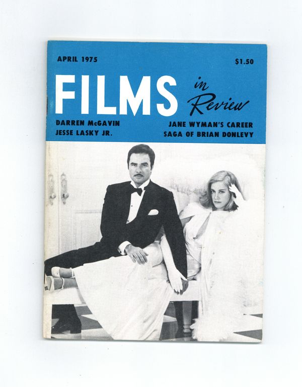 Published Apr 1975 by National Board of Review of Motion Pictures Inc..$7.80Film in Review is a publication of the National Board of Review of Motion Pictures, Inc, an independent, non-profit organization of public citizens founded in 1909 to represent the interests of the motion picture public. This National Board further assists the development of the motion picture as a source of entertainment, as education, and as art, by providing media for the expression of the public's opinion about films and their cultural and social effects. 5 1/2-in. x 7 1/2-in., 64 pages, B&W. Cover price $1.50.