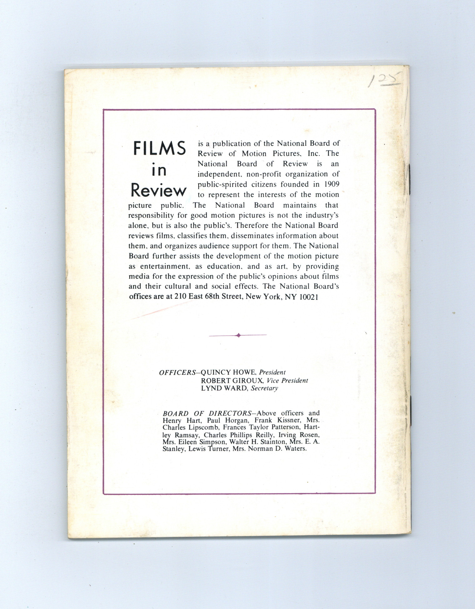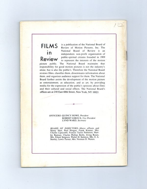 Film in Review is a publication of the National Board of Review of Motion Pictures, Inc, an independent, non-profit organization of public citizens founded in 1909 to represent the interests of the motion picture public. This National Board further assists the development of the motion picture as a source of entertainment, as education, and as art, by providing media for the expression of the public's opinion about films and their cultural and social effects. 5 1/2-in. x 7 1/2-in., 64 pages, B&W. Cover price $1.50.