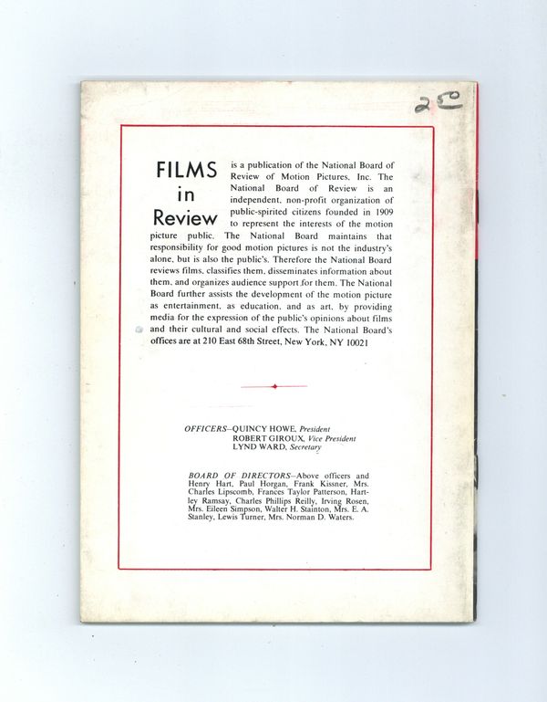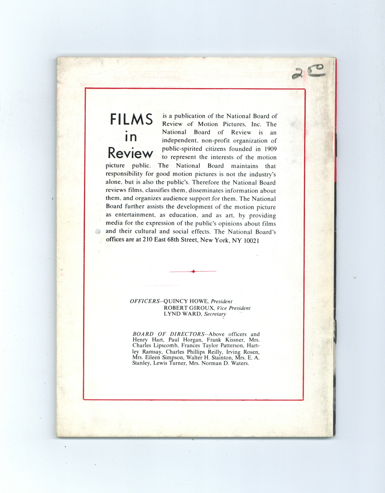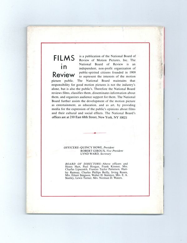 Film in Review is a publication of the National Board of Review of Motion Pictures, Inc, an independent, non-profit organization of public citizens founded in 1909 to represent the interests of the motion picture public. This National Board further assists the development of the motion picture as a source of entertainment, as education, and as art, by providing media for the expression of the public's opinion about films and their cultural and social effects. 5 1/2-in. x 7 1/2-in., 64 pages, B&W. Cover price $1.50.