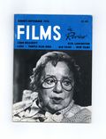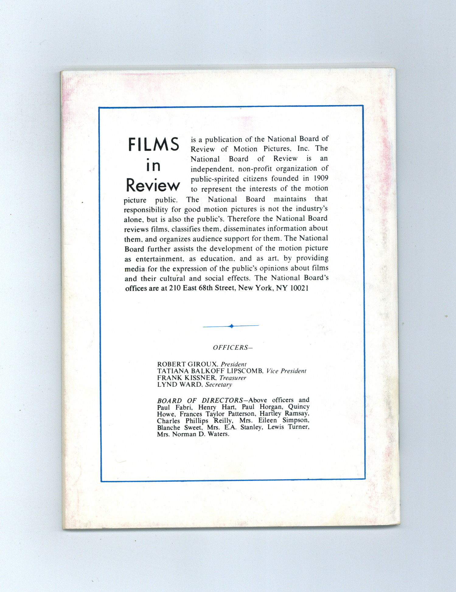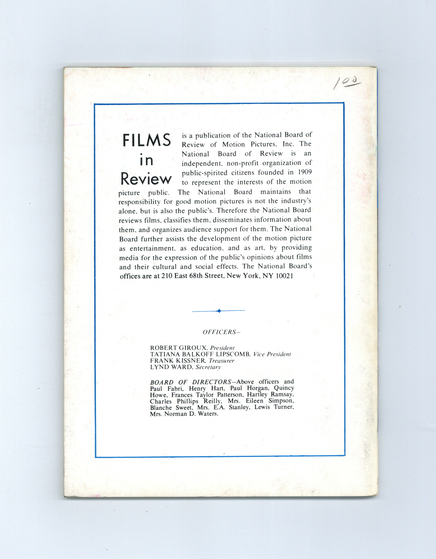 Film in Review is a publication of the National Board of Review of Motion Pictures, Inc, an independent, non-profit organization of public citizens founded in 1909 to represent the interests of the motion picture public. This National Board further assists the development of the motion picture as a source of entertainment, as education, and as art, by providing media for the expression of the public's opinion about films and their cultural and social effects. 5 1/2-in. x 7 1/2-in., 64 pages, B&W. Cover price $1.50.