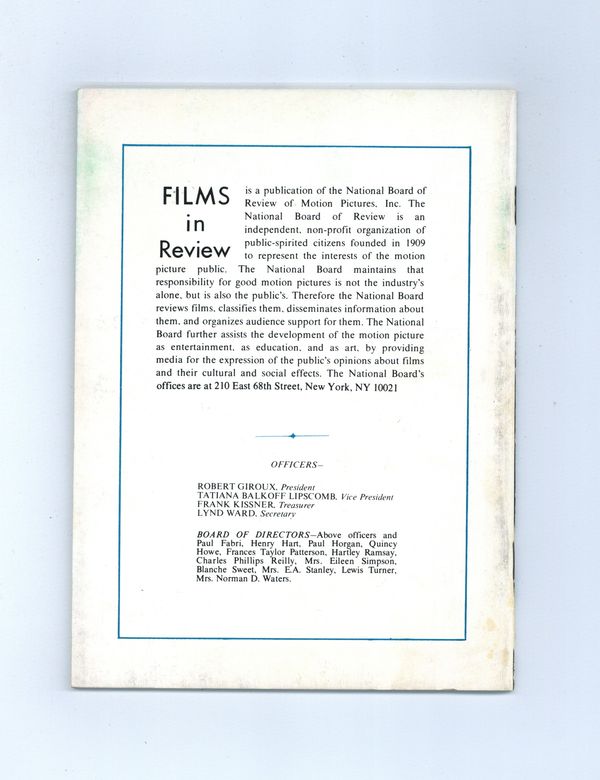 Film in Review is a publication of the National Board of Review of Motion Pictures, Inc, an independent, non-profit organization of public citizens founded in 1909 to represent the interests of the motion picture public. This National Board further assists the development of the motion picture as a source of entertainment, as education, and as art, by providing media for the expression of the public's opinion about films and their cultural and social effects. 5 1/2-in. x 7 1/2-in., 64 pages, B&W. Cover price $1.50.