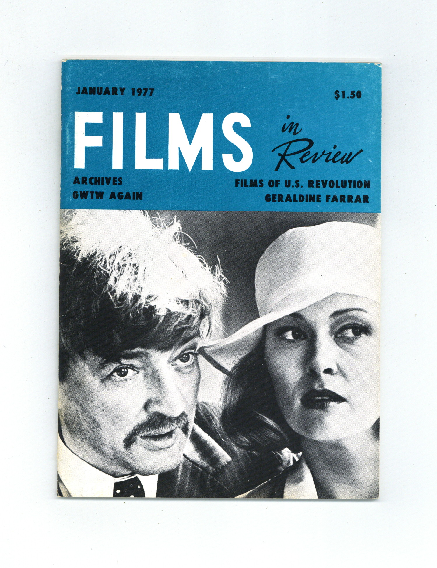 Published Jan 1977 by National Board of Review of Motion Pictures Inc..$11.00Film in Review is a publication of the National Board of Review of Motion Pictures, Inc, an independent, non-profit organization of public citizens founded in 1909 to represent the interests of the motion picture public. This National Board further assists the development of the motion picture as a source of entertainment, as education, and as art, by providing media for the expression of the public's opinion about films and their cultural and social effects. 5 1/2-in. x 7 1/2-in., 64 pages, B&W. Cover price $1.50.