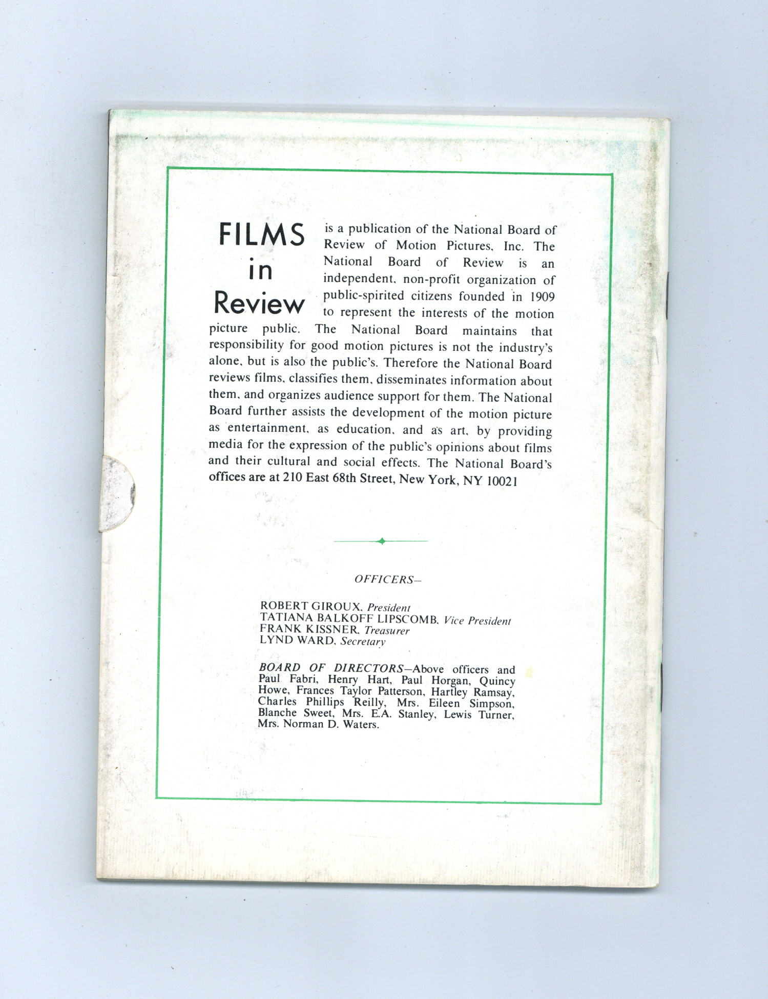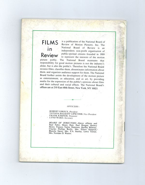 Film in Review is a publication of the National Board of Review of Motion Pictures, Inc, an independent, non-profit organization of public citizens founded in 1909 to represent the interests of the motion picture public. This National Board further assists the development of the motion picture as a source of entertainment, as education, and as art, by providing media for the expression of the public's opinion about films and their cultural and social effects. 5 1/2-in. x 7 1/2-in., 64 pages, B&W. Cover price $1.50.