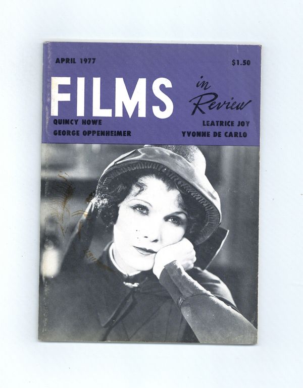 Published Apr 1977 by National Board of Review of Motion Pictures Inc..$7.80Film in Review is a publication of the National Board of Review of Motion Pictures, Inc, an independent, non-profit organization of public citizens founded in 1909 to represent the interests of the motion picture public. This National Board further assists the development of the motion picture as a source of entertainment, as education, and as art, by providing media for the expression of the public's opinion about films and their cultural and social effects. 5 1/2-in. x 7 1/2-in., 64 pages, B&W. Cover price $1.50.
