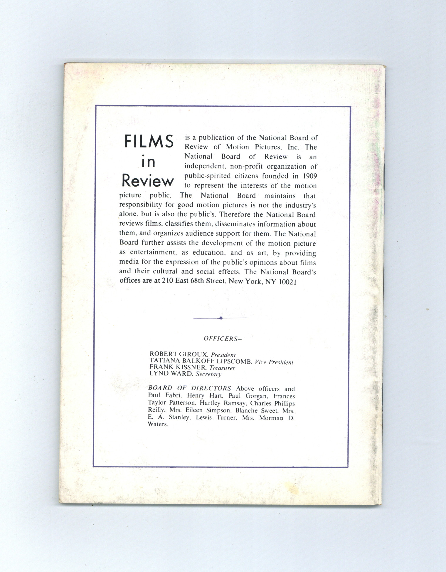Film in Review is a publication of the National Board of Review of Motion Pictures, Inc, an independent, non-profit organization of public citizens founded in 1909 to represent the interests of the motion picture public. This National Board further assists the development of the motion picture as a source of entertainment, as education, and as art, by providing media for the expression of the public's opinion about films and their cultural and social effects. 5 1/2-in. x 7 1/2-in., 64 pages, B&W. Cover price $1.50.