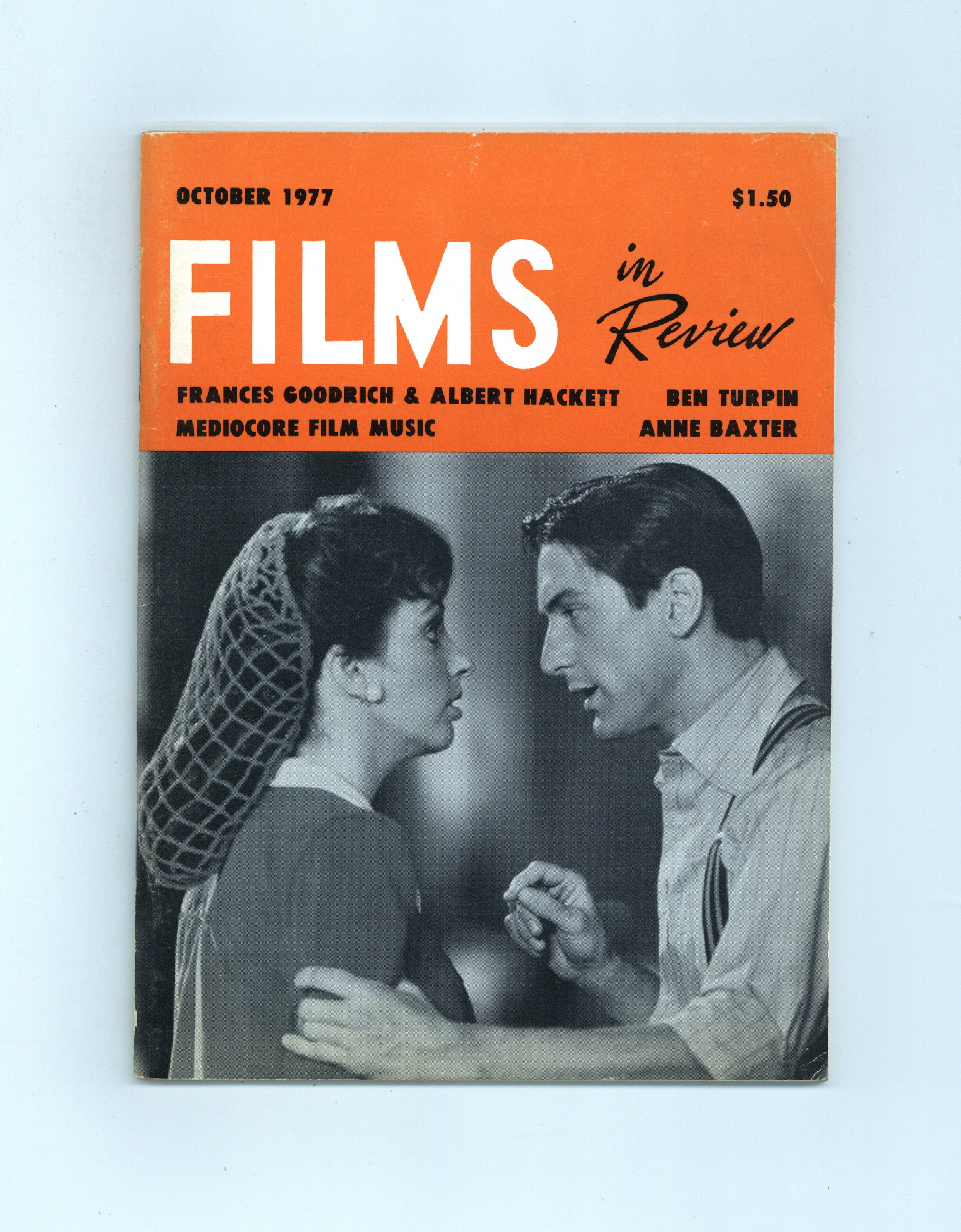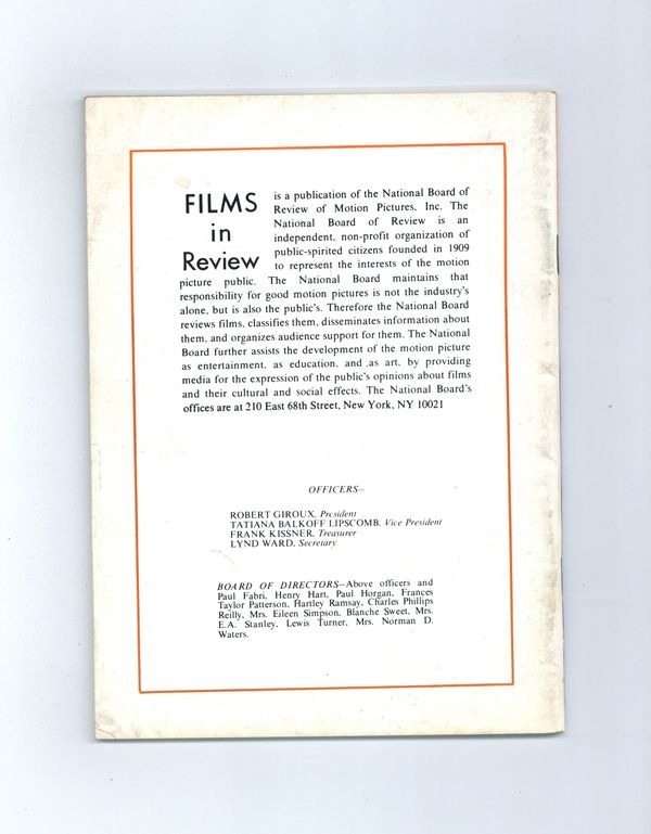 Film in Review is a publication of the National Board of Review of Motion Pictures, Inc, an independent, non-profit organization of public citizens founded in 1909 to represent the interests of the motion picture public. This National Board further assists the development of the motion picture as a source of entertainment, as education, and as art, by providing media for the expression of the public's opinion about films and their cultural and social effects. 5 1/2-in. x 7 1/2-in., 64 pages, B&W. Cover price $1.50.