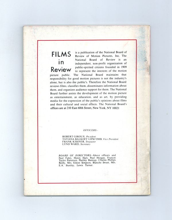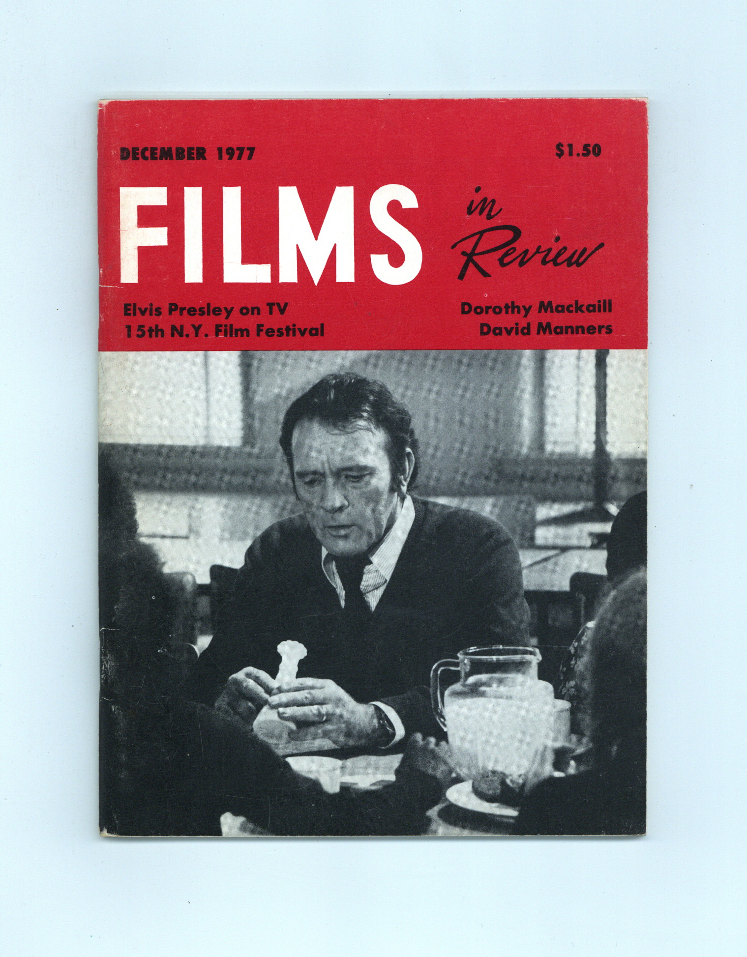 Published Dec 1977 by National Board of Review of Motion Pictures Inc..$12.00Film in Review is a publication of the National Board of Review of Motion Pictures, Inc, an independent, non-profit organization of public citizens founded in 1909 to represent the interests of the motion picture public. This National Board further assists the development of the motion picture as a source of entertainment, as education, and as art, by providing media for the expression of the public's opinion about films and their cultural and social effects. 5 1/2-in. x 7 1/2-in., 64 pages, B&W. Cover price $1.50.