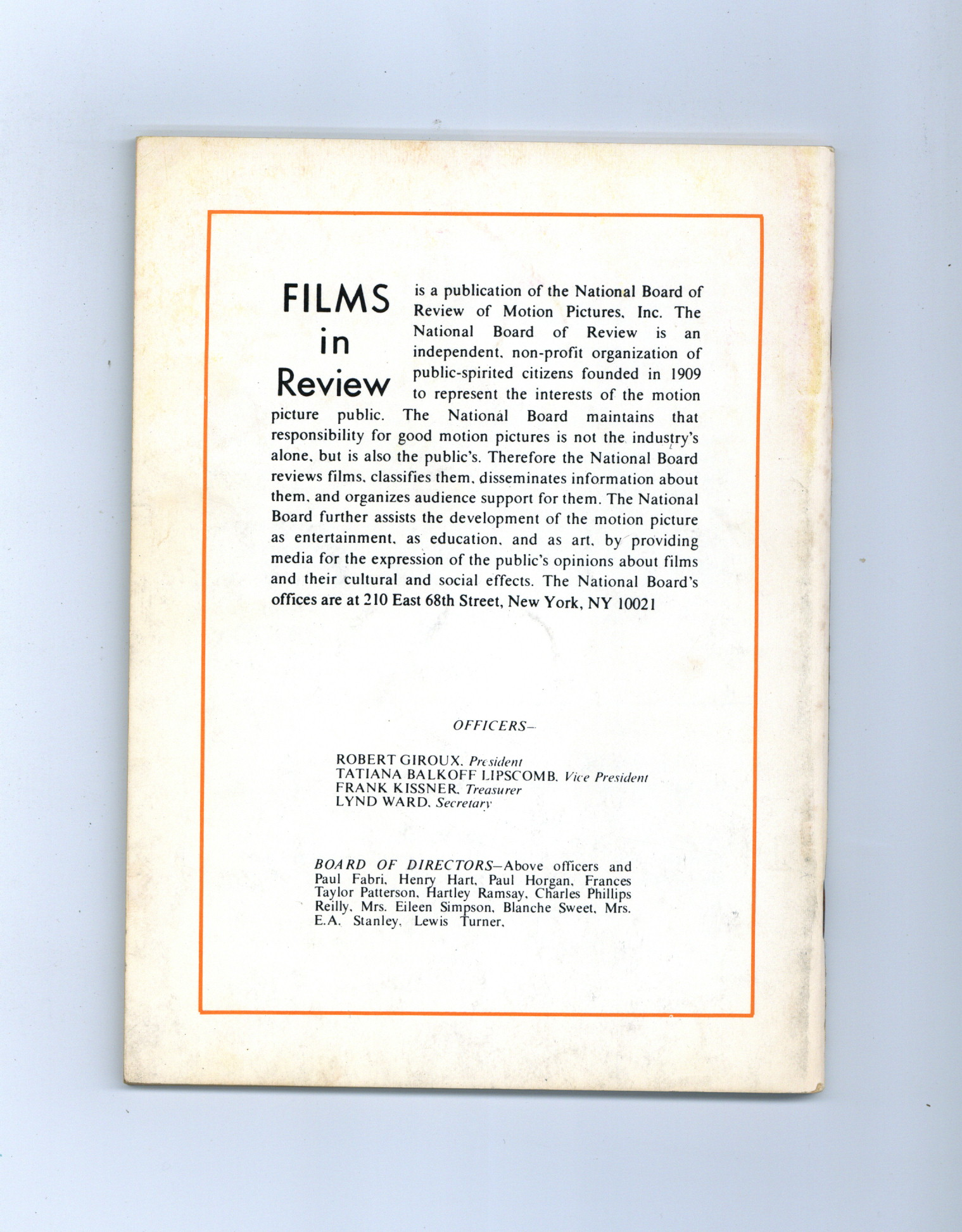 Film in Review is a publication of the National Board of Review of Motion Pictures, Inc, an independent, non-profit organization of public citizens founded in 1909 to represent the interests of the motion picture public. This National Board further assists the development of the motion picture as a source of entertainment, as education, and as art, by providing media for the expression of the public's opinion about films and their cultural and social effects. 5 1/2-in. x 7 1/2-in., 64 pages, B&W. Cover price $1.50.