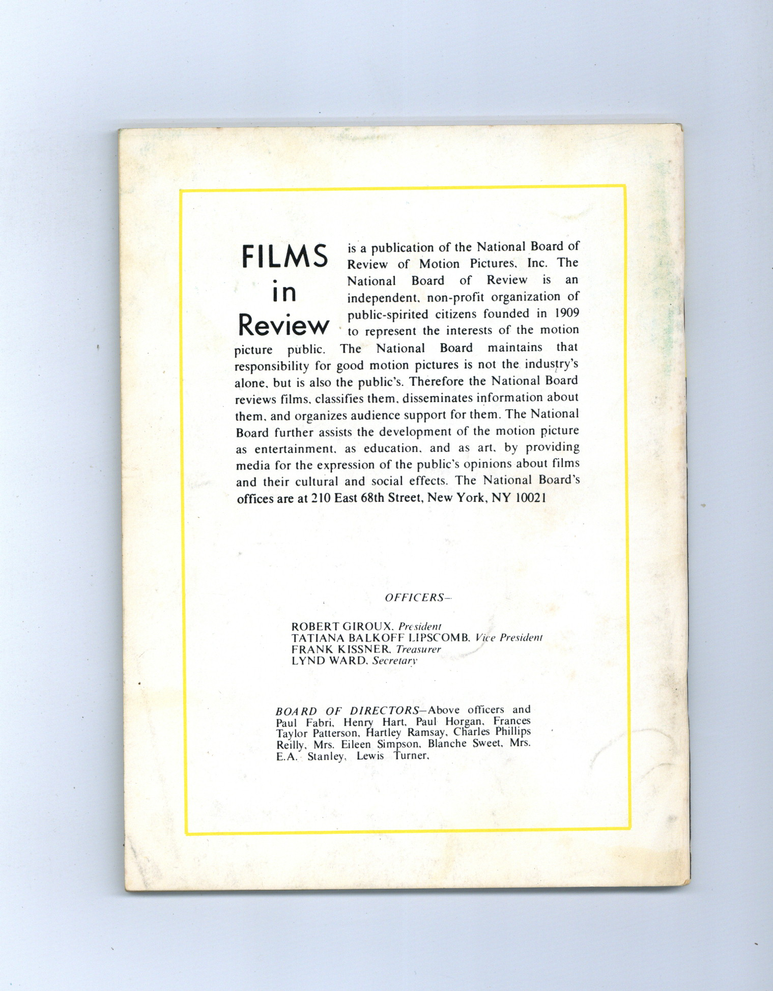 Film in Review is a publication of the National Board of Review of Motion Pictures, Inc, an independent, non-profit organization of public citizens founded in 1909 to represent the interests of the motion picture public. This National Board further assists the development of the motion picture as a source of entertainment, as education, and as art, by providing media for the expression of the public's opinion about films and their cultural and social effects. 5 1/2-in. x 7 1/2-in., 64 pages, B&W. Cover price $1.50.