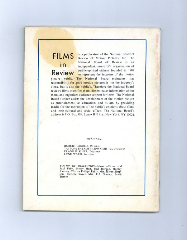 Film in Review is a publication of the National Board of Review of Motion Pictures, Inc, an independent, non-profit organization of public citizens founded in 1909 to represent the interests of the motion picture public. This National Board further assists the development of the motion picture as a source of entertainment, as education, and as art, by providing media for the expression of the public's opinion about films and their cultural and social effects. 5 1/2-in. x 7 1/2-in., 64 pages, B&W. Cover price $1.75.