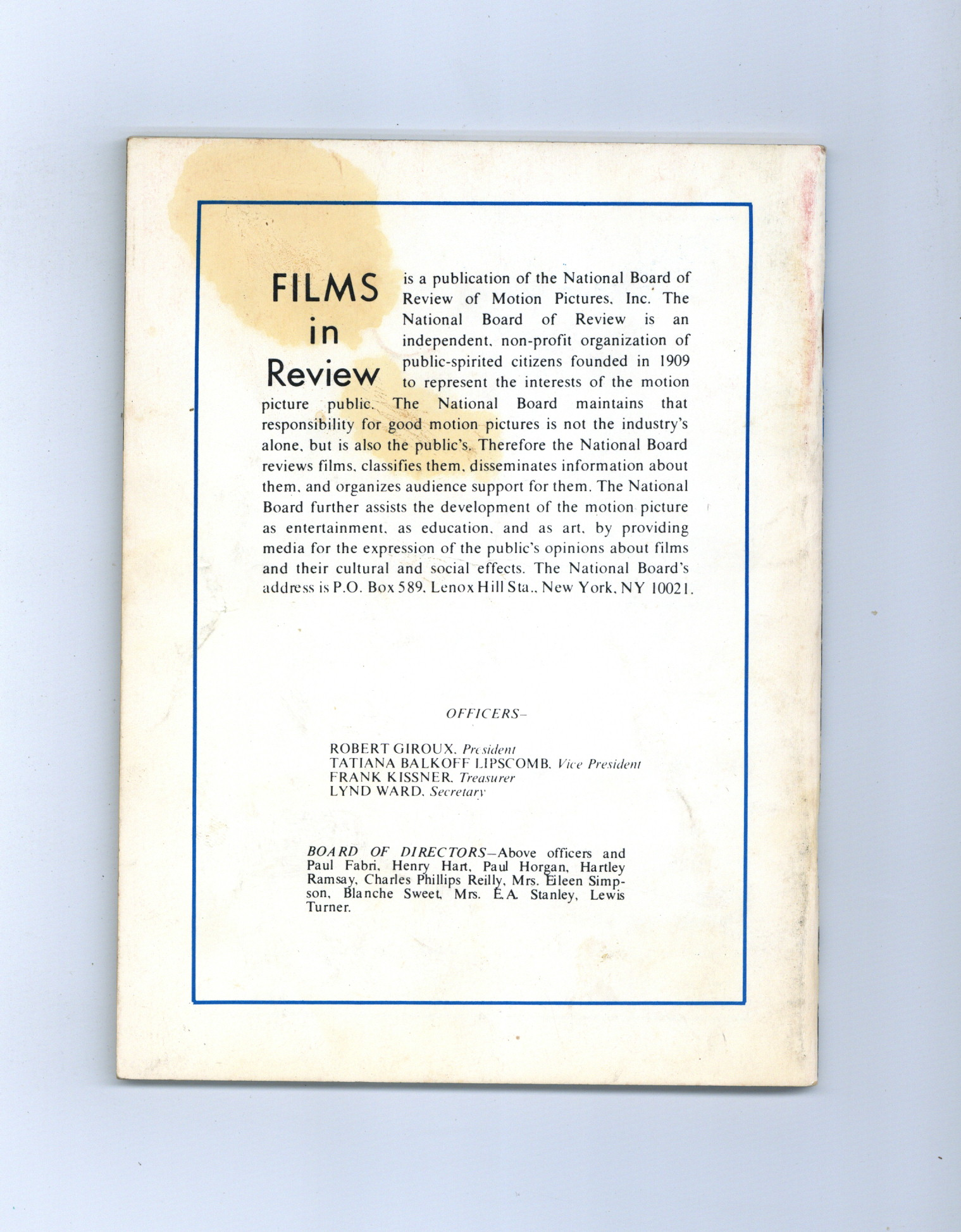 Published Nov 1978 by National Board of Review of Motion Pictures Inc..$4.00- Water damage: Moderate. Staple rust: Slight.