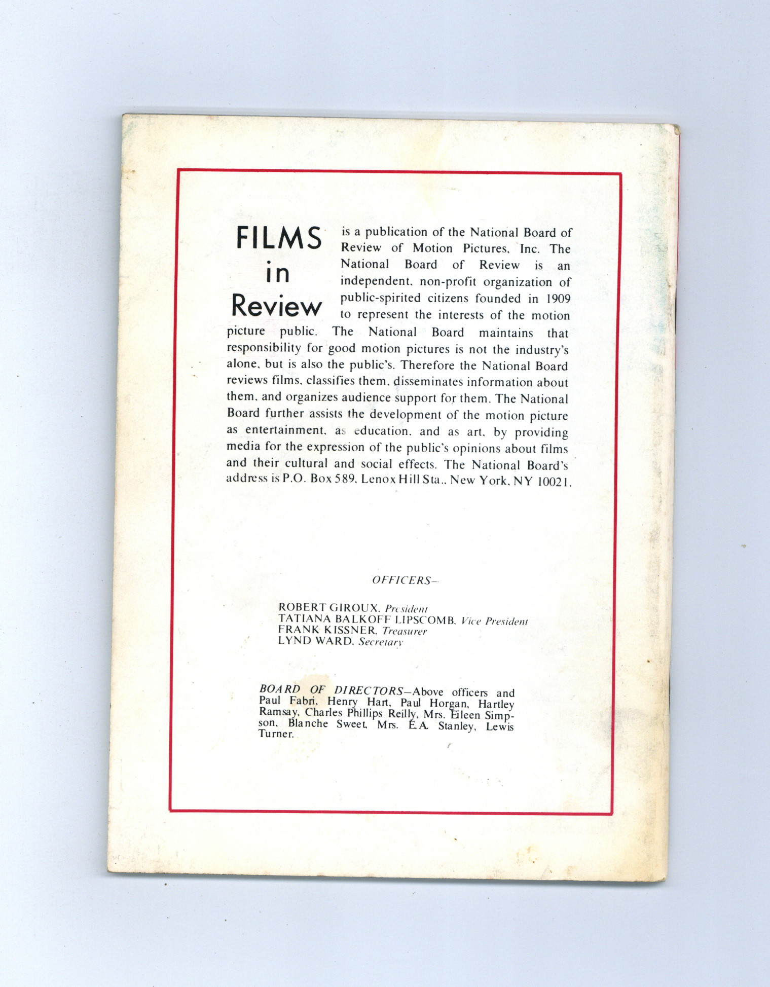 Film in Review is a publication of the National Board of Review of Motion Pictures, Inc, an independent, non-profit organization of public citizens founded in 1909 to represent the interests of the motion picture public. This National Board further assists the development of the motion picture as a source of entertainment, as education, and as art, by providing media for the expression of the public's opinion about films and their cultural and social effects. 5 1/2-in. x 7 1/2-in., 64 pages, B&W. Cover price $1.75.