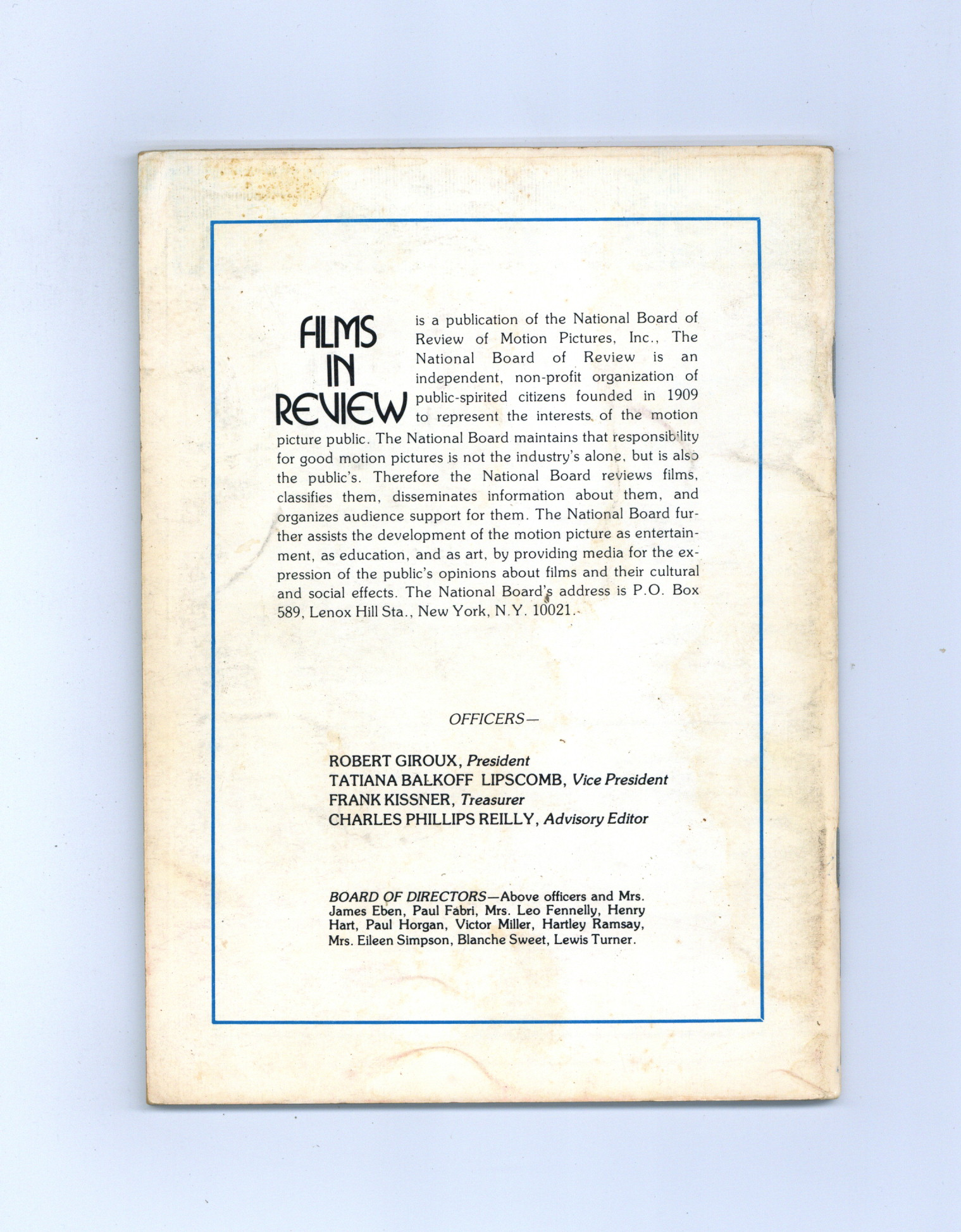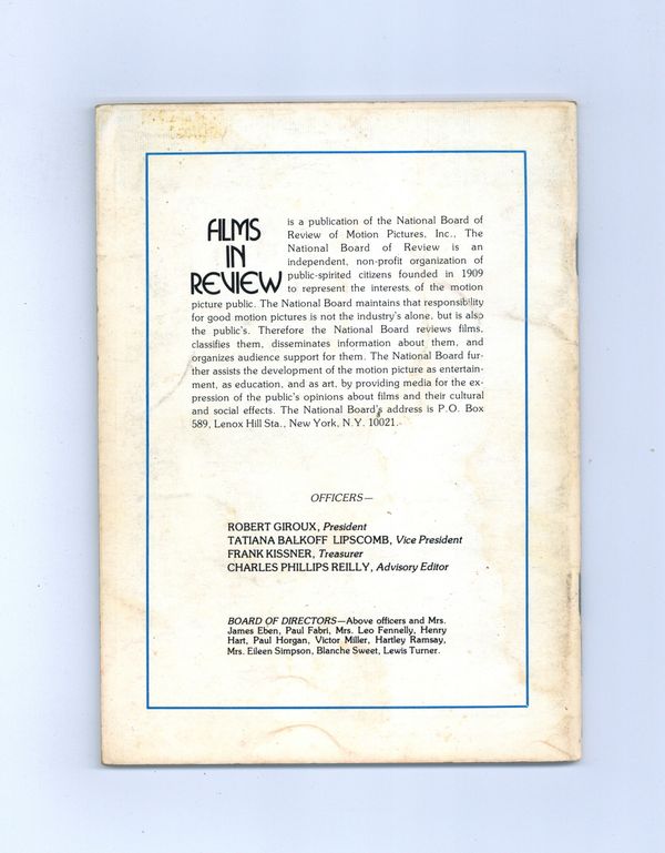 Published Sep 1979 by National Board of Review of Motion Pictures Inc..$4.00Film in Review is a publication of the National Board of Review of Motion Pictures, Inc, an independent, non-profit organization of public citizens founded in 1909 to represent the interests of the motion picture public. This National Board further assists the development of the motion picture as a source of entertainment, as education, and as art, by providing media for the expression of the public's opinion about films and their cultural and social effects. 5 1/2-in. x 7 1/2-in., 64 pages, B&W. Cover price $1.75.