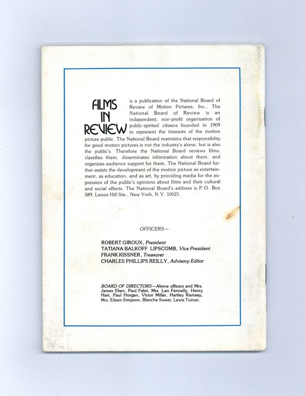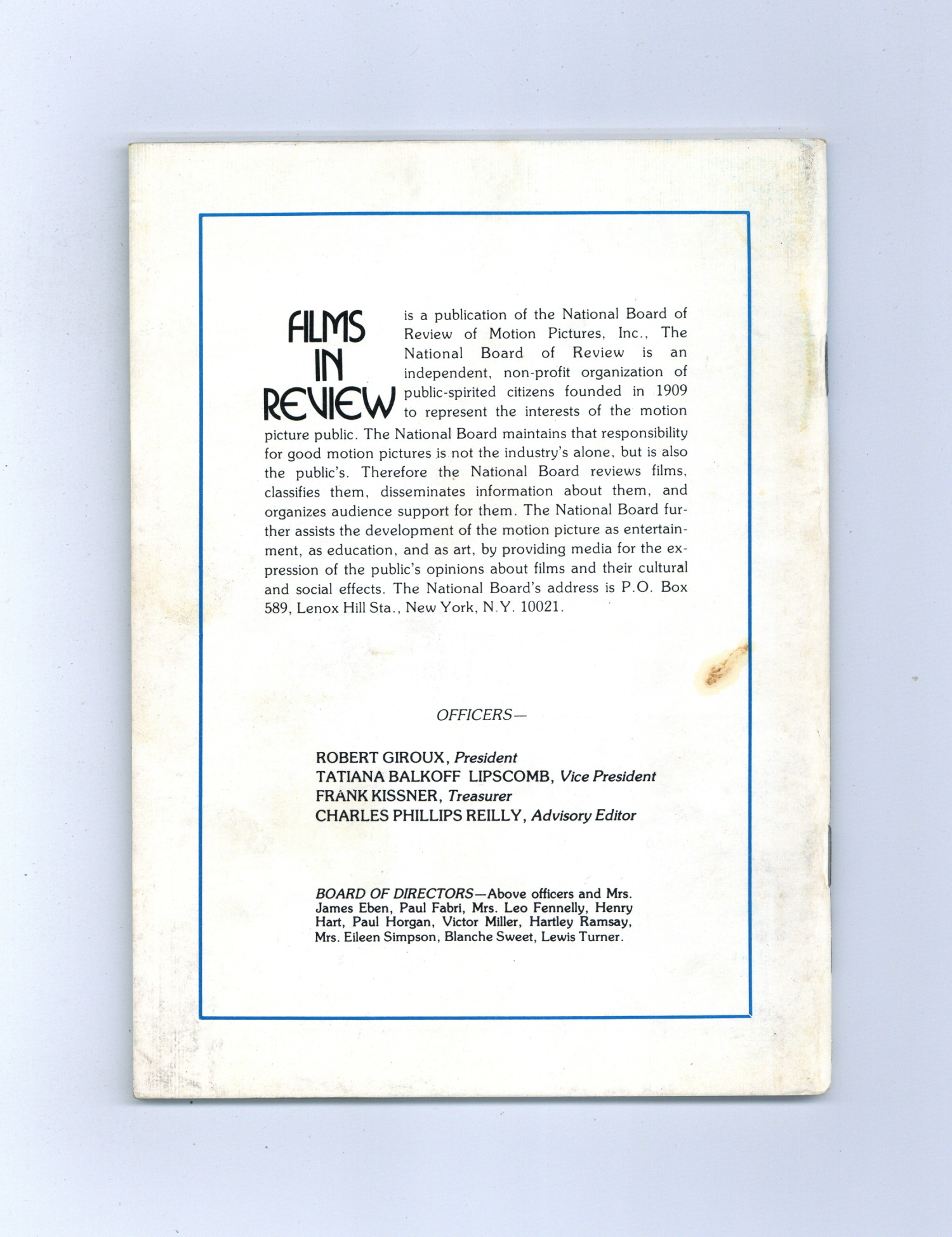 Film in Review is a publication of the National Board of Review of Motion Pictures, Inc, an independent, non-profit organization of public citizens founded in 1909 to represent the interests of the motion picture public. This National Board further assists the development of the motion picture as a source of entertainment, as education, and as art, by providing media for the expression of the public's opinion about films and their cultural and social effects. 5 1/2-in. x 7 1/2-in., 64 pages, B&W. Cover price $1.75.