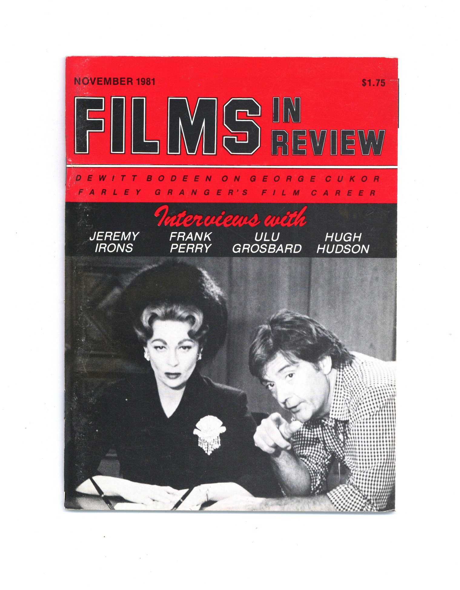 Published Nov 1981 by National Board of Review of Motion Pictures Inc..$17.00Film in Review is a publication of the National Board of Review of Motion Pictures, Inc, an independent, non-profit organization of public citizens founded in 1909 to represent the interests of the motion picture public. This National Board further assists the development of the motion picture as a source of entertainment, as education, and as art, by providing media for the expression of the public's opinion about films and their cultural and social effects. 5 1/2-in. x 7 1/2-in., 64 pages, B&W. Cover price $1.75.