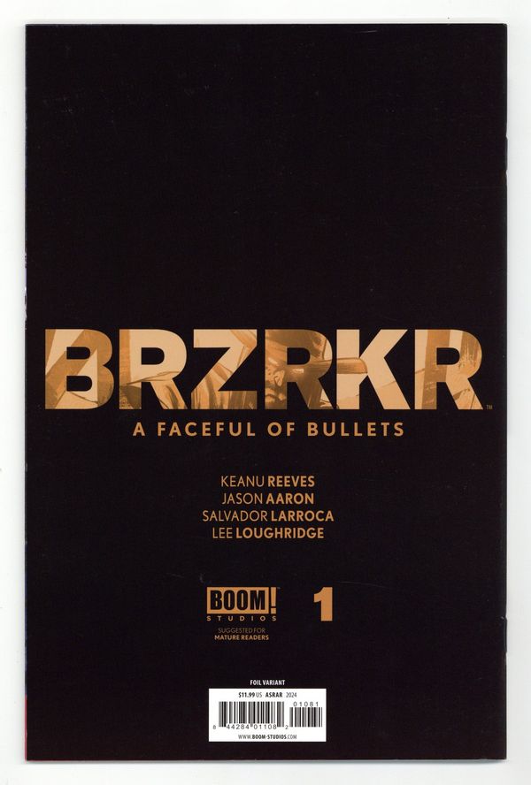 Published Jul 2024 by Boom Studios.$30.00Limited 1 for 100 Retailer Incentive Variant Cover. Written by Jason Aaron. Art by Francesco Manna. Cover by Mahmud Asrar. When B. finds himself in the middle of a greedy land baron and a runaway daughter, will he play the role of guardian angel, or angel of death? And when she prays for the vengeance she so obsessively clings to, the bloodbath may be more than she bargained for… Legendary comics writer Jason Aaron (Teenage Mutant Ninja Turtles, Batman Off-World) enters the brutal world of BRZRKR along with acclaimed artist Francesco Manna (Predator: The Last Hunt, Carnage). 56 pages, full color. Rated M Cover price $11.99.