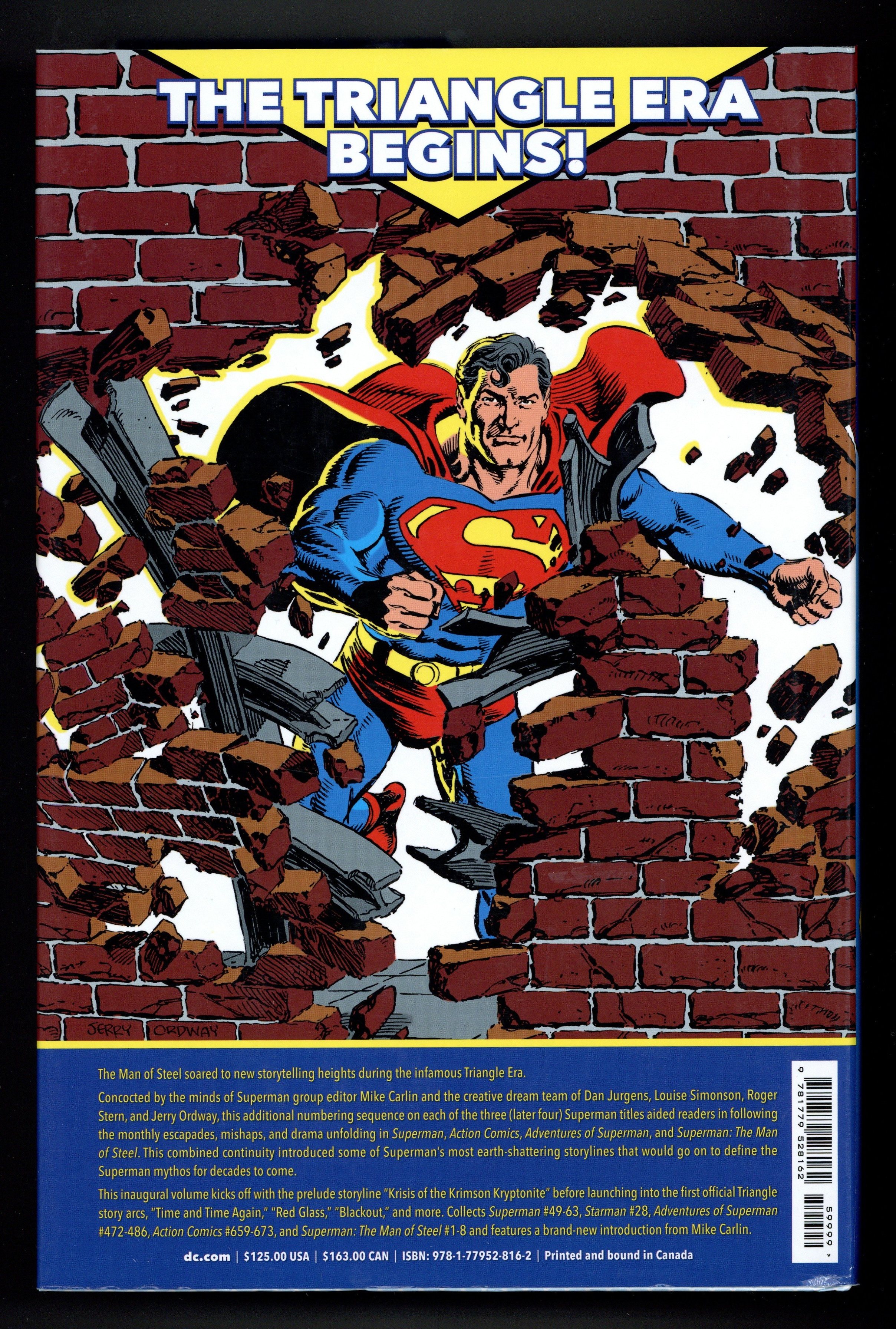 1st printing. Collects Superman (1987-2011 2nd Series) #49-63, Starman (1988-1992 1st Series) #28, The Adventures of Superman (1987-2006) #472-486, Action Comics (1938-2011 DC) #659-673, and Superman: The Man of Steel (1991-2003) #1-8. Written by Jerry Ordway, Dan Jurgens, Roger Stern, Louise Simonson, James D. Hudnall, Karl Kessel, Karl Kessel, and Dennis Janke. Art by Jerry Ordway, Dan Jurgens, Bob McLeod, Jon Bogdanove, Tom Grummett, Kerry Gammill, Ed Hannigan, Curt Swan, John Byrne, Jim Mooney, Art Thibert, Jim Fern, Kieron Dwyer, Dave Hoover, Karl Kessel, Dennis Janke, Brett Breeding, Doug Hazlewood, Willie Blyberg, Denis Rodier, Eduardo Barreto, Jose Marzan, Jr., Brad Vancata, and Scott Hanna. Cover by Jerry Ordway. The Man of Steel soared to new storytelling heights during the fabled Triangle Era, where each Superman title contained a new numbering sequence that allowed readers to follow the action across four weekly issues. Under the direction of group editor Mike Carlin, the creative dream team of Dan Jurgens, Louise Simonson, Roger Stern, and Jerry Ordway crafted some of Superman's most earth-shattering storylines that would go on to define the Superman mythos for decades to come. This inaugural Triangle Era volume collects the story arcs Time and Again, Red Glass, Blackout, and more, and features a brand-new introduction by Mike Carlin. Hardcover, 8 1/2-in. x 11-in., 1,376 pages, full color. Teen Cover price $125.00.