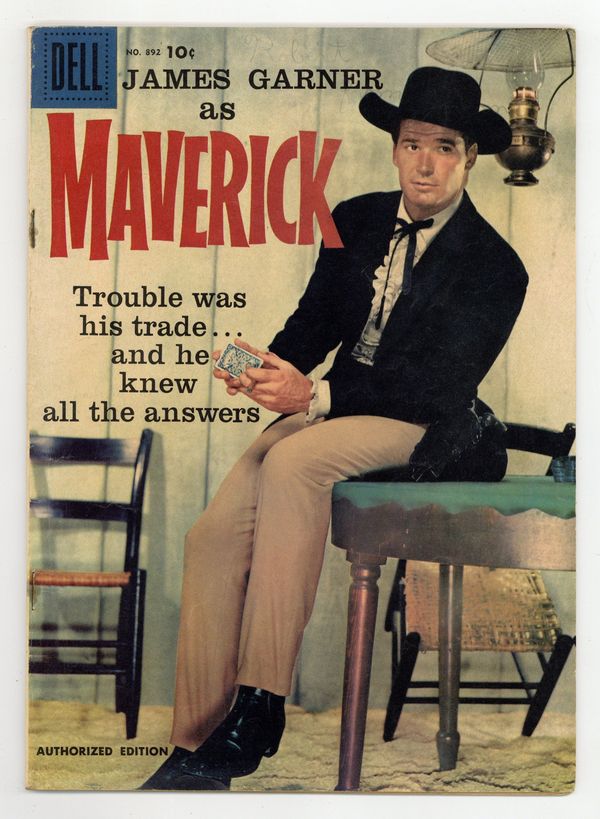 Photo Cover shows Bret Maverick (as played by James Garner). Written by Eric Freiwald and Robert Schaefer. Art by Dan Spiegle. Trouble was his trade...and he knew all the answers! Based on the 1957-62 ABC TV series Maverick. First of six Maverick Four Color issues. Featuring the tales "War of the Silver Kings" and "Pinto River Swindle," plus the 1-page stories "Washoe Canaries" and "Skin Game." 36 pages, full color. Cover price $0.10.