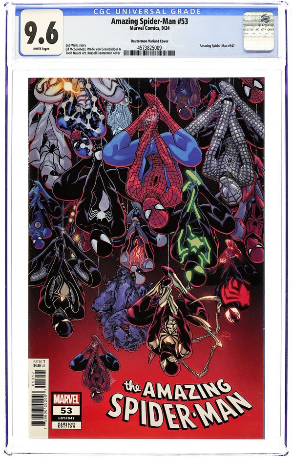 Limited 1 for 25 Retailer Incentive Variant Cover. Written by Zeb Wells. Art by Ed McGuinness. Cover by Russell Dauterman. SECRET REVEALED - MEET SPIDER-GOBLIN! Following the shocking events of #50, PETER PARKER is a changed man. He's now SPIDER-GOBLIN, the most dangerous superhuman in the world. And his chaos is DEADLY! Meanwhile, who will stop Norman Osborn?! 32 pages, full color. Rated T Cover price $4.99.